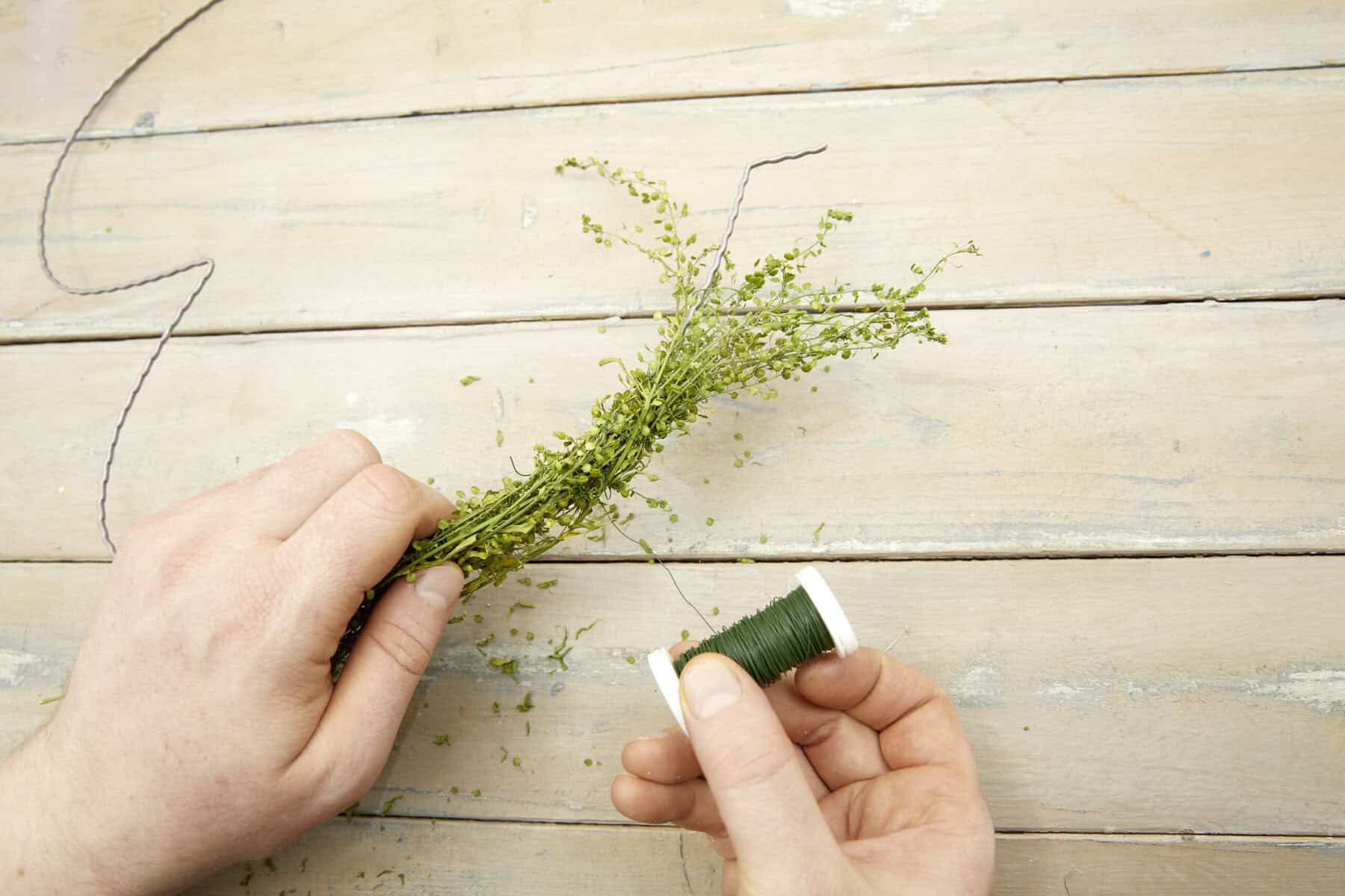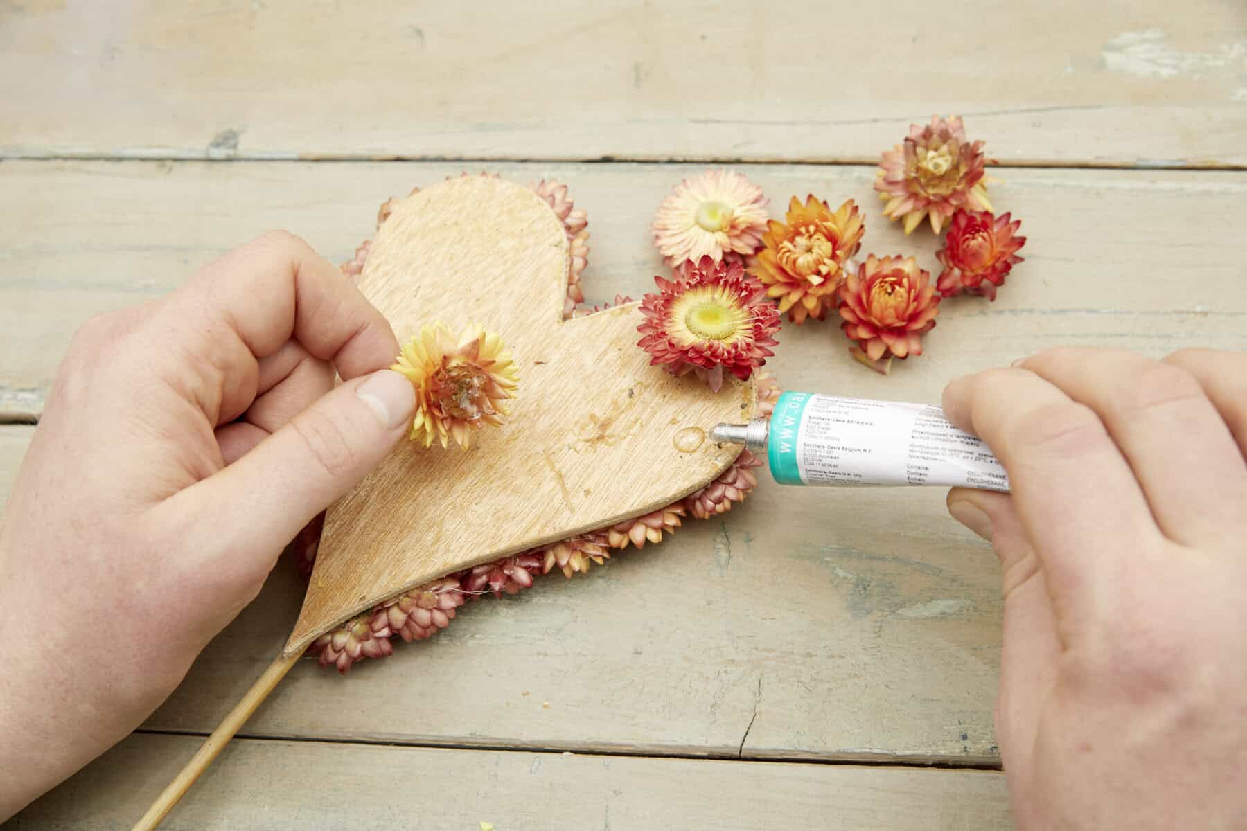 Das Holzherz unten anbohren und den Splittstab einstecken. Dann die Oberfläche mit Helichrysum-Blüten bekleben. Ein Gefäß mit Wasser sowie Hühnerdraht als alternative Steckhilfe füllen und die Werkstoffe einarbeiten. Zum Schluss den Herzstecker integrieren und eine Schnur anknoten.