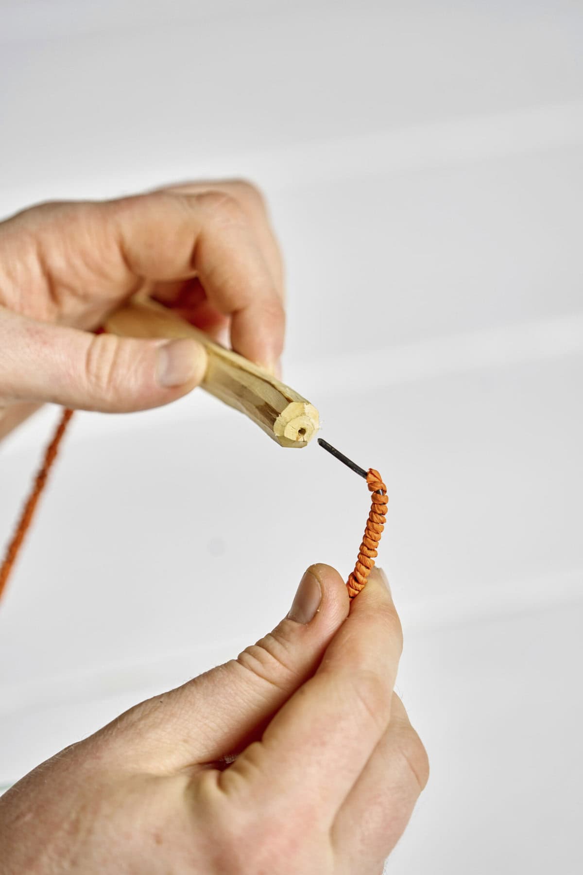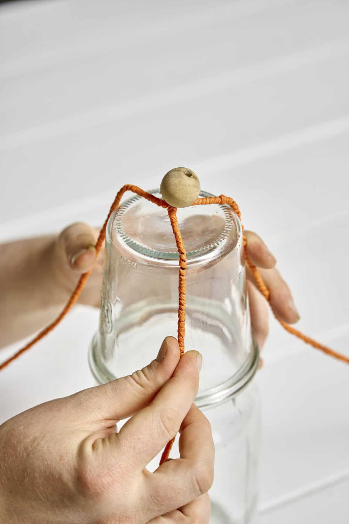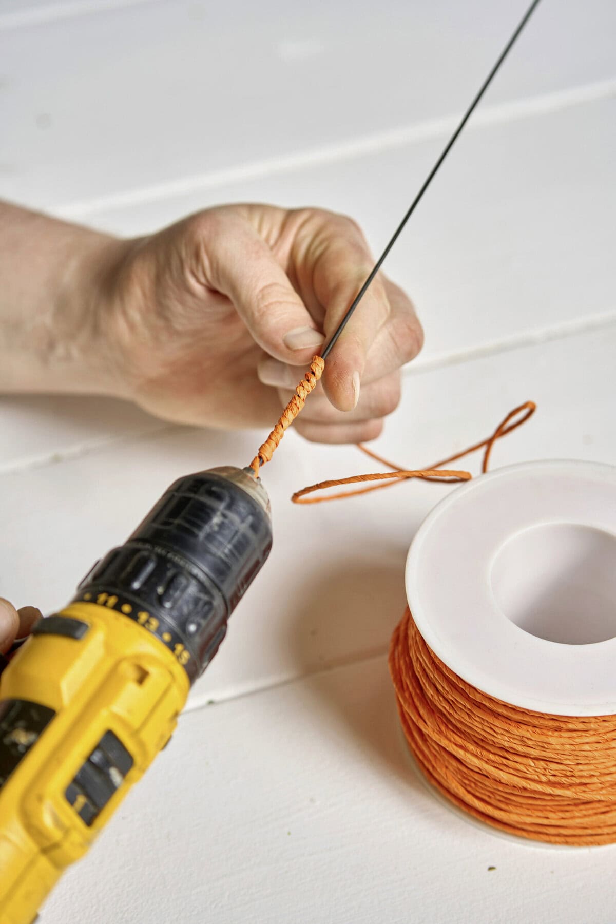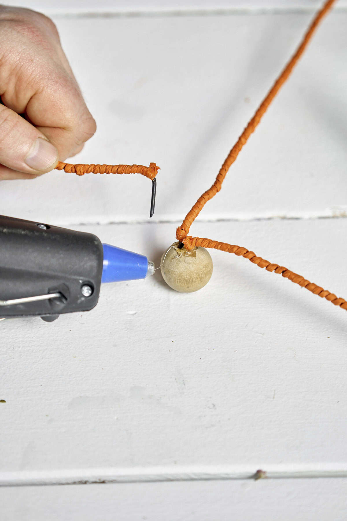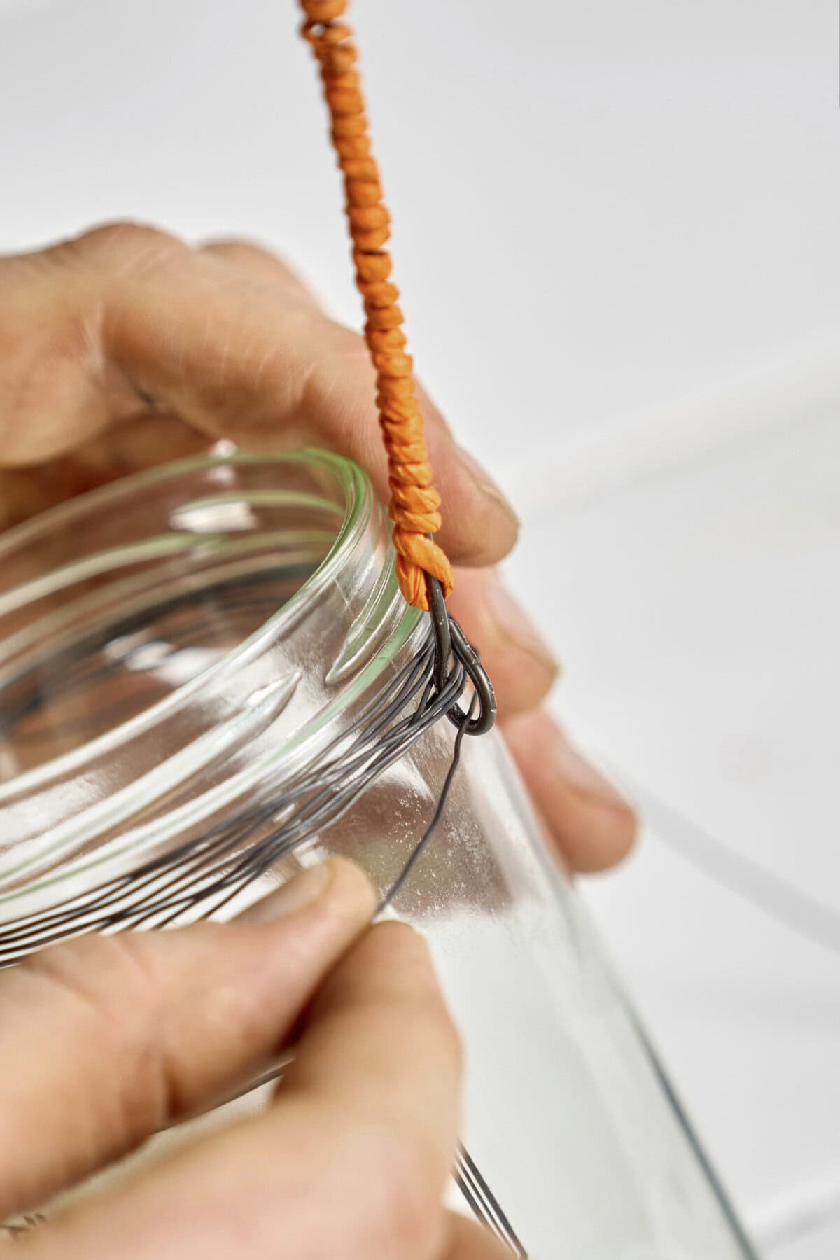 Mithilfe des auf langsam drehend eingestellten Akkubohrers wird ein eingespannter Steckdraht mit Rebenbindedraht umwickelt. Dann drei solcher umwickelten Steckdrähte in eine Holzperle stecken und dort mit Heißkleber fixieren. Perle auf die Unterseite des Glases legen und die Drähte seitlich zur umklammernden Halterung formen. Die anderen Enden über dem Glas zusammenführen, gemeinsam zu einer Schlaufe binden und damit aufhängen. Wasser ins Glas füllen und die Blumen locker einstellen.