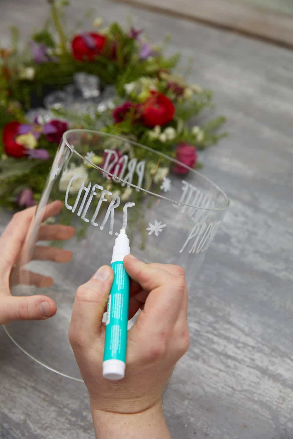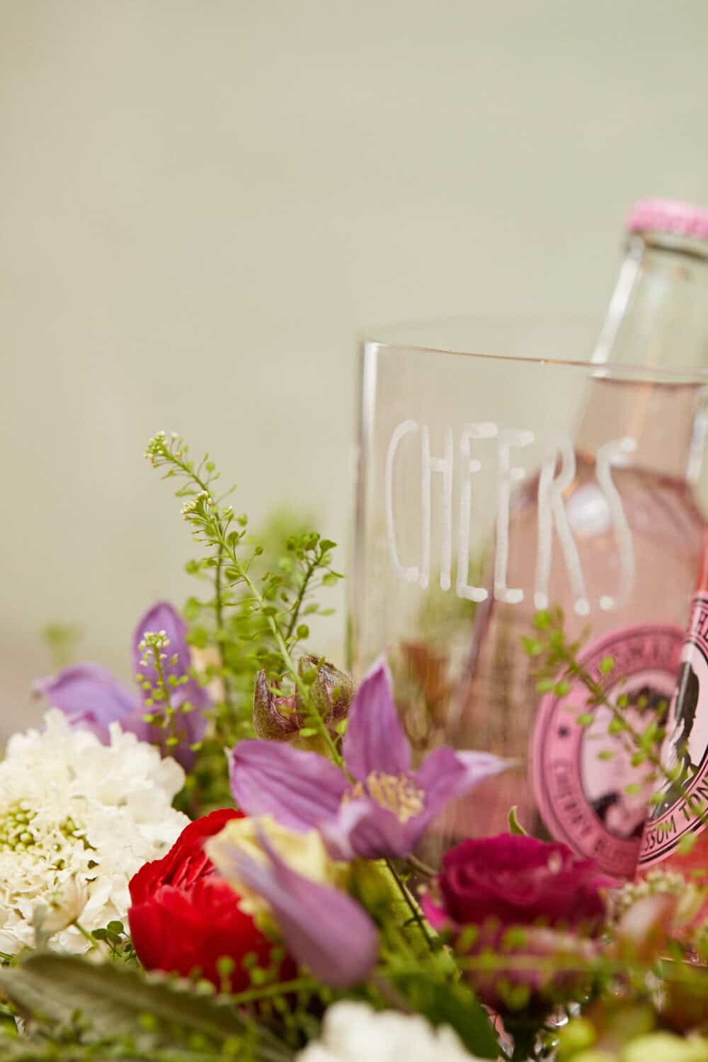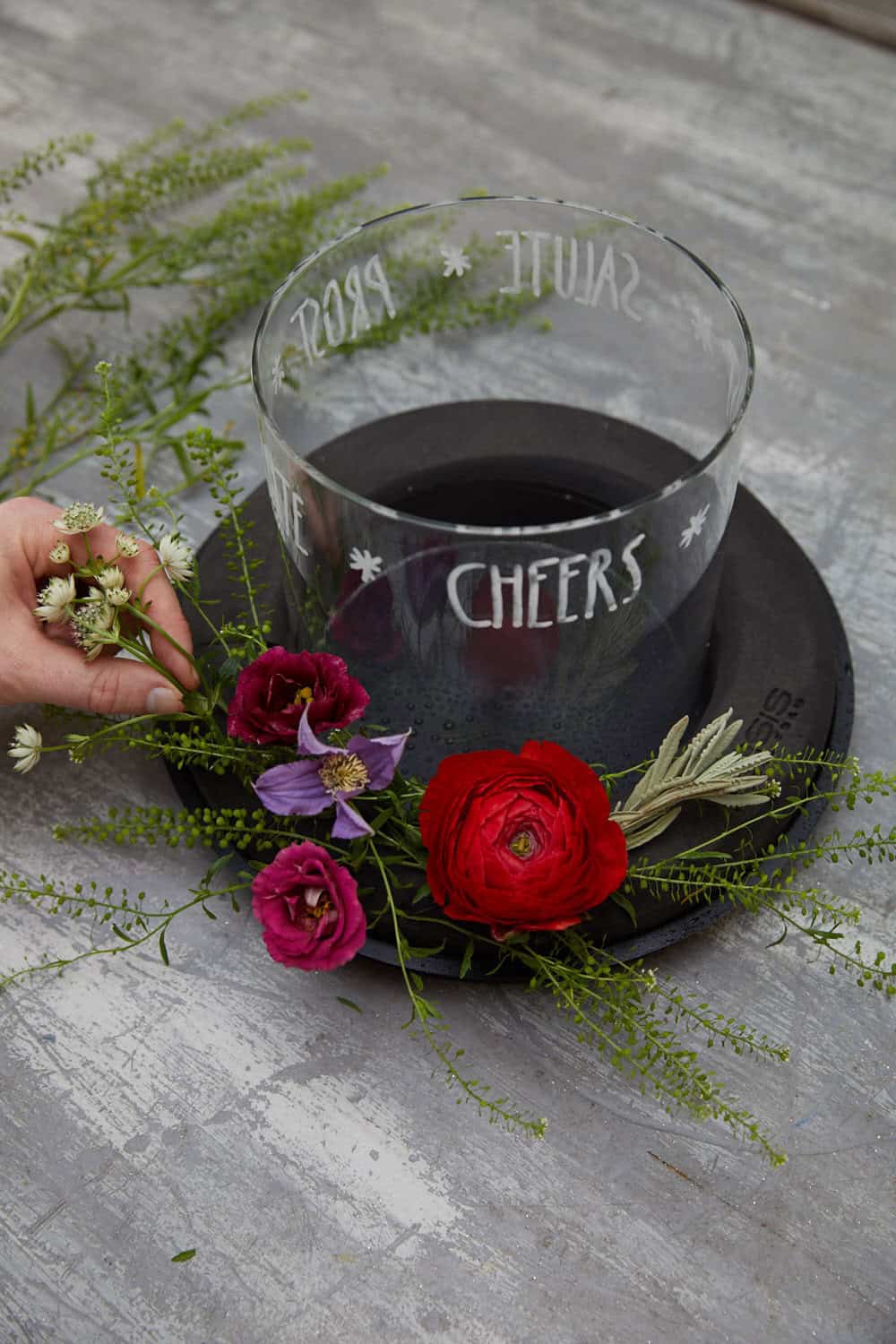 Zuerst den Steckschaum wässern und das Glas am Rand mit einem Kreidestift beschriften. Anschließend das Glas in die Kranzsteckbasis mit geschlossener Kunststoffschale einsetzen und die Basis mit Floralien bestecken. Zum Schluss werden noch die Getränkeflaschen sowie die Eiswürfel in das Glas gegeben.