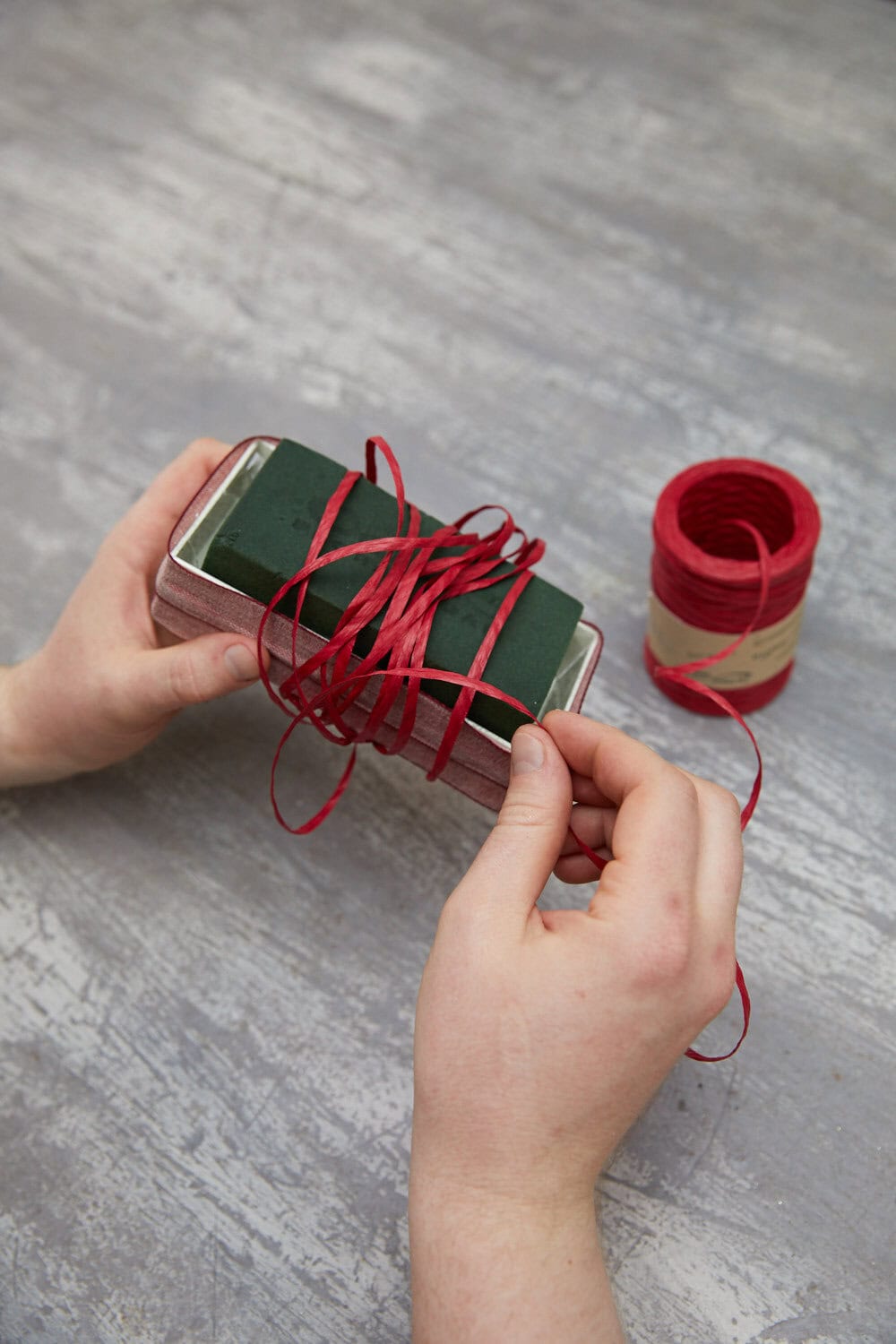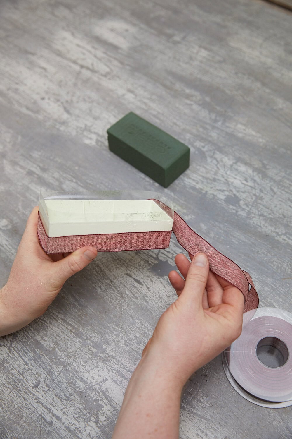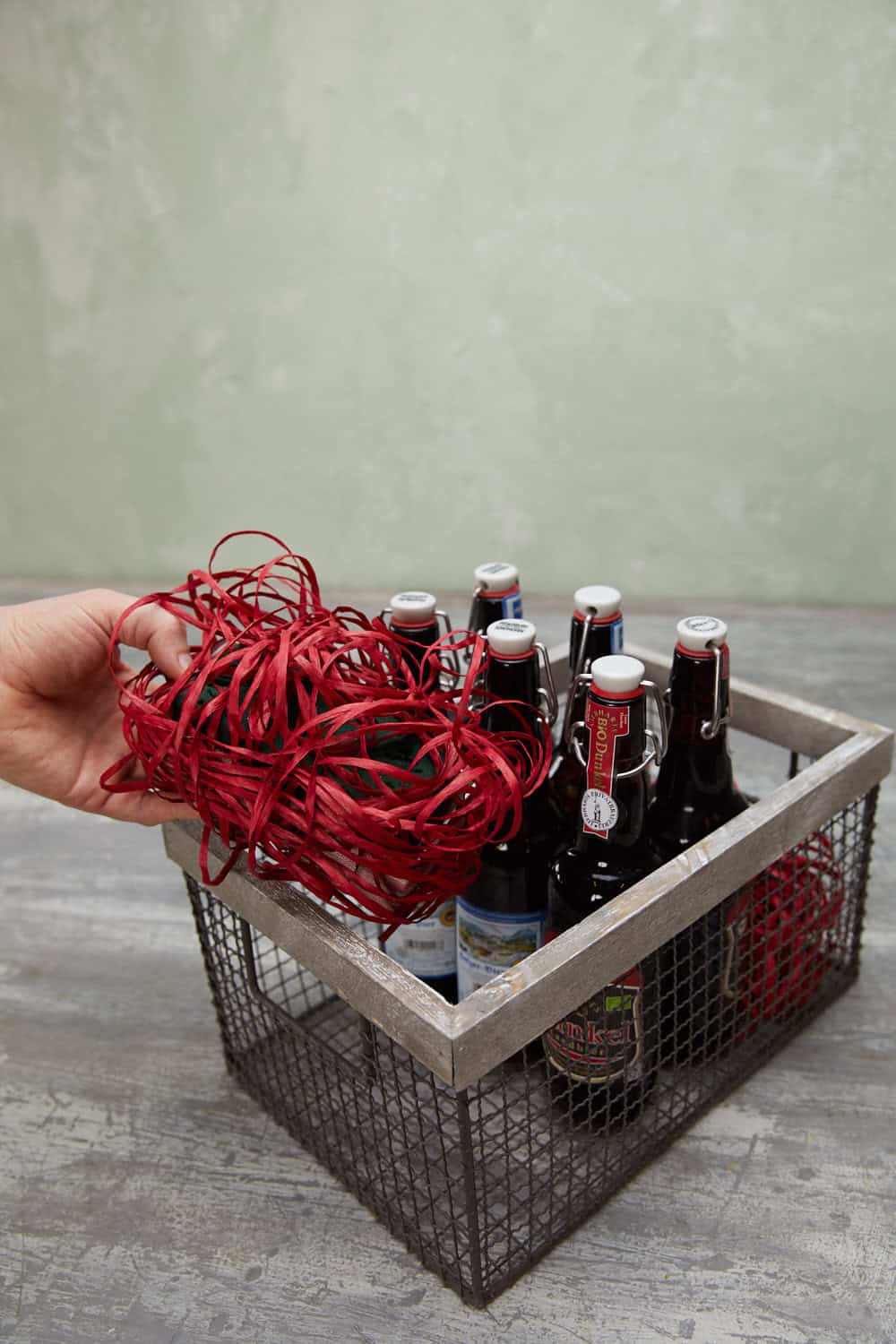 Als Erstes den Steckschaum wässern und die leere Kunststoffschale mit Band umkleben. Dann den gewässerten Steckschaum wieder hineingeben. Nun die Schale mit wasserfestem Band locker umwickeln. Zwei solcher Schalen an den Korbseiten platzieren und die Getränkeflaschen in den Zwischenraum stellen. Anschließend werden dann die Frischfloralien eingesteckt.