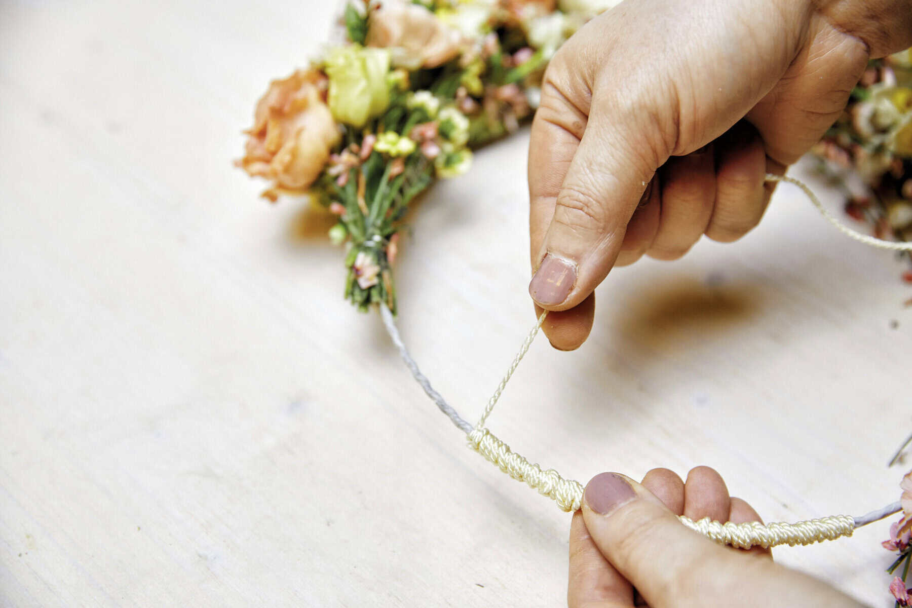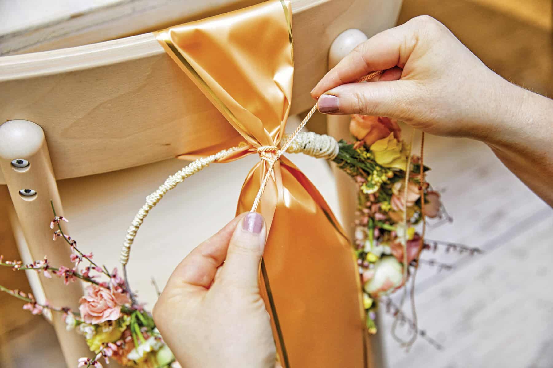 Den Wellendrahtring mit Tape umwickeln, dann die Floralien asymmetrisch auf den Ring binden und den freien Teil mit Kordel umwickeln. Das Schmuckband über die Stuhllehne legen und den Kranz dazwischen platzieren, sodass ein Band vor und ein Band hinter dem Kranz liegt. Die Bänder unter dem Loop mit Kordel zusammenbinden, sodass der Loop gehalten wird. Die Kordel lang herabhängen lassen und Mini-Tontöpfe an den Enden festknoten.