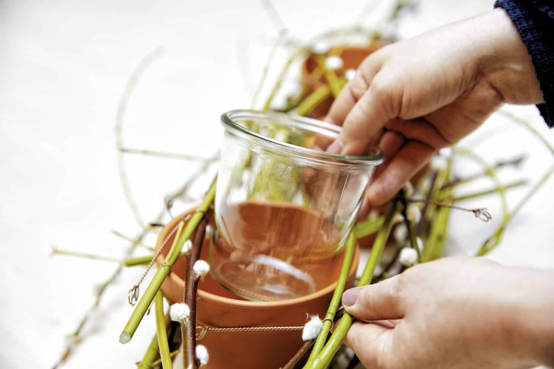 Die Zweige mithilfe des Twisters und Twistdrahts zu einem länglichen Gestell zusammenrödeln. Tontöpfe zwischen den Zweigen einklemmen. Weckgläser in die Tontöpfe einstellen, mit Wasser füllen und die Floralien einstellen. Zum Schluss mit kleineren Tontöpfen und Zwiebeln ergänzen.