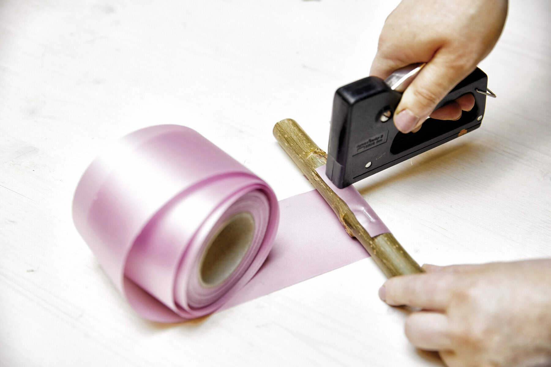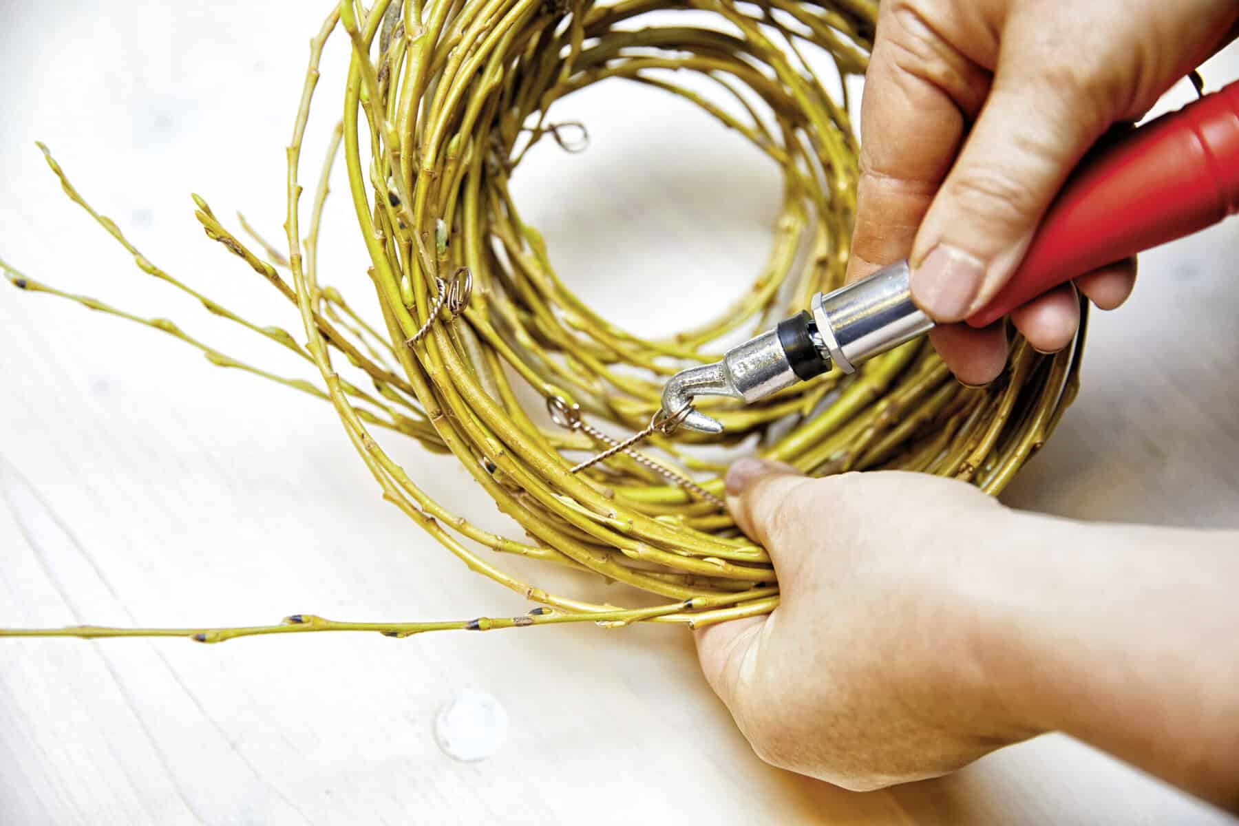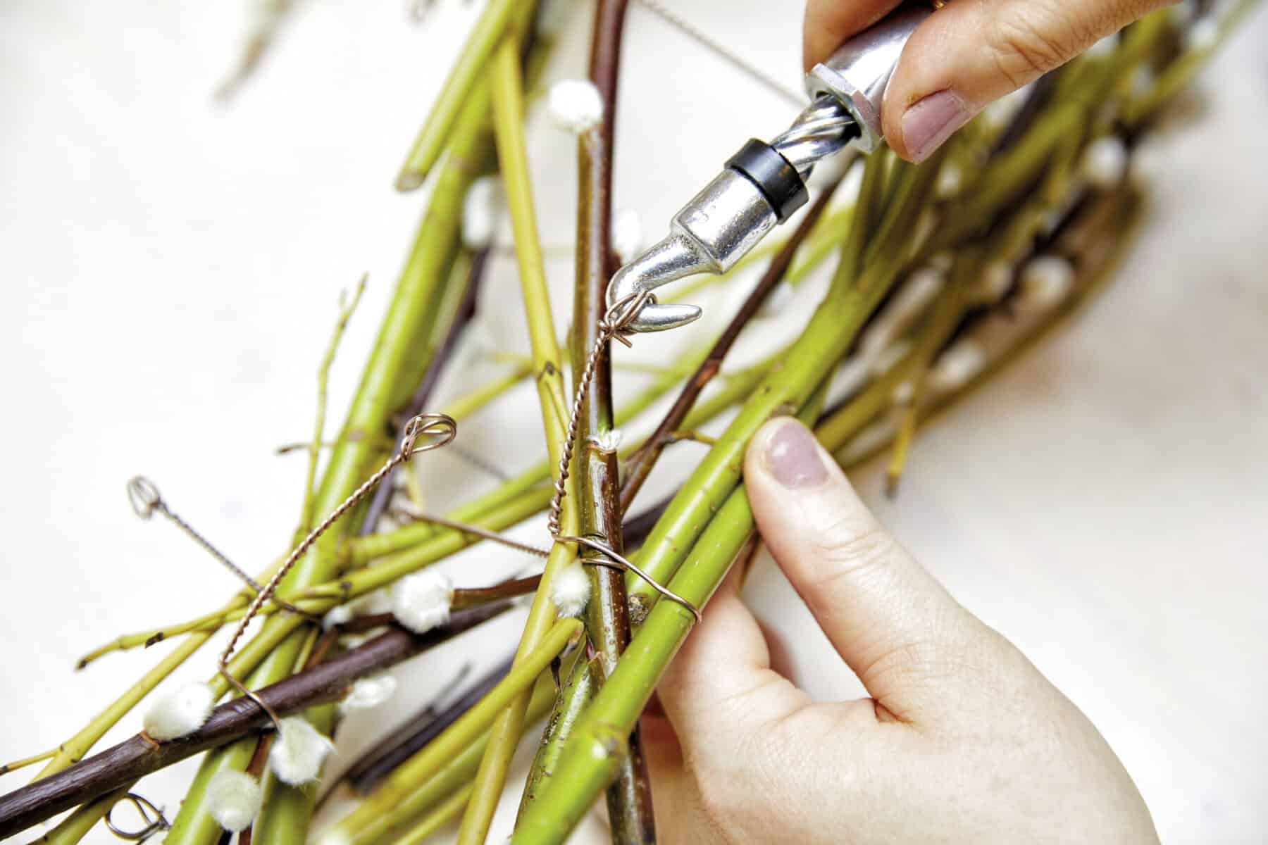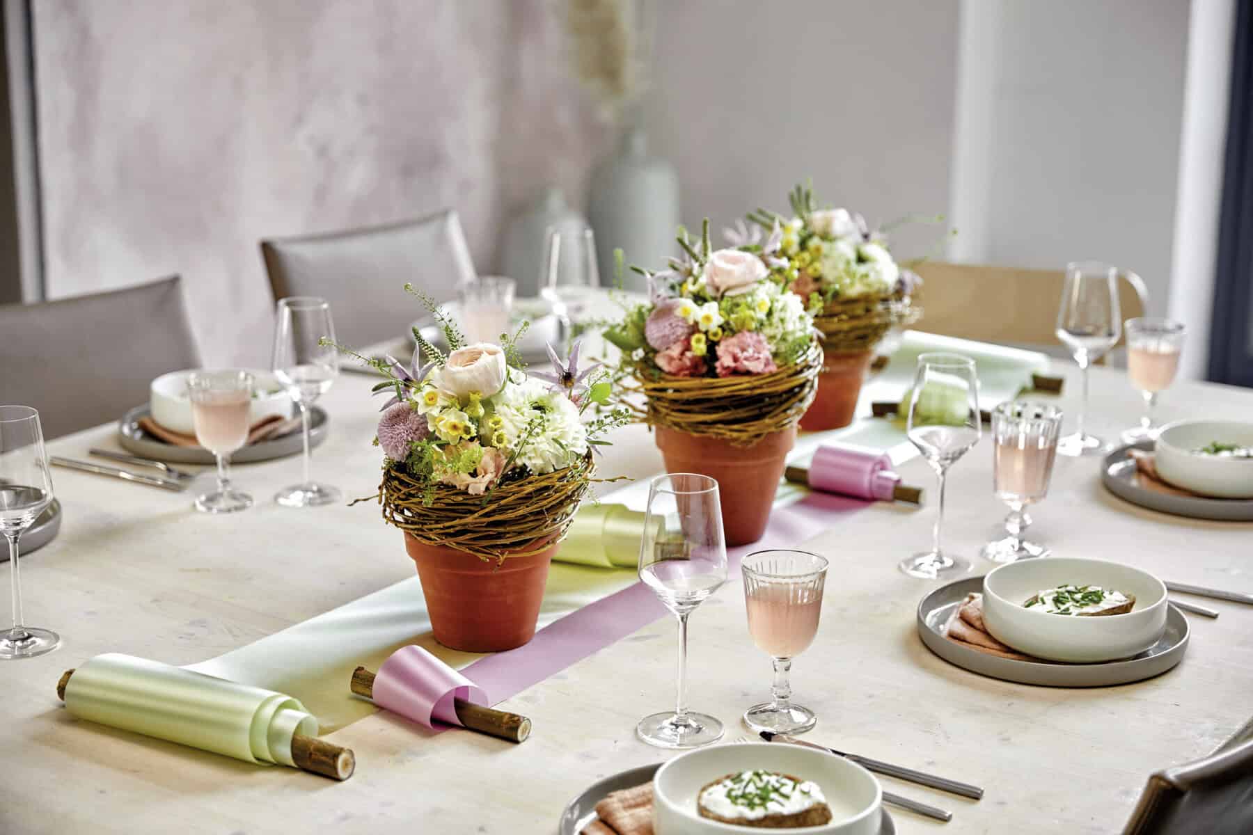Die Trauerweidenzweige zu einem konisch zulaufenden Nest winden und mithilfe des Twisters immer wieder punktuell fixieren. Das Nest auf dem Tontopfrand platzieren. Ein Glasgefäß einstellen, mit Wasser füllen, die Blumen zu einem Strauß binden und einstellen. Schmuckband an ein Aststück tackern und als Tischband über den Tisch legen, dabei am Ende etwas Band dekorativ auf den Ast aufrollen.