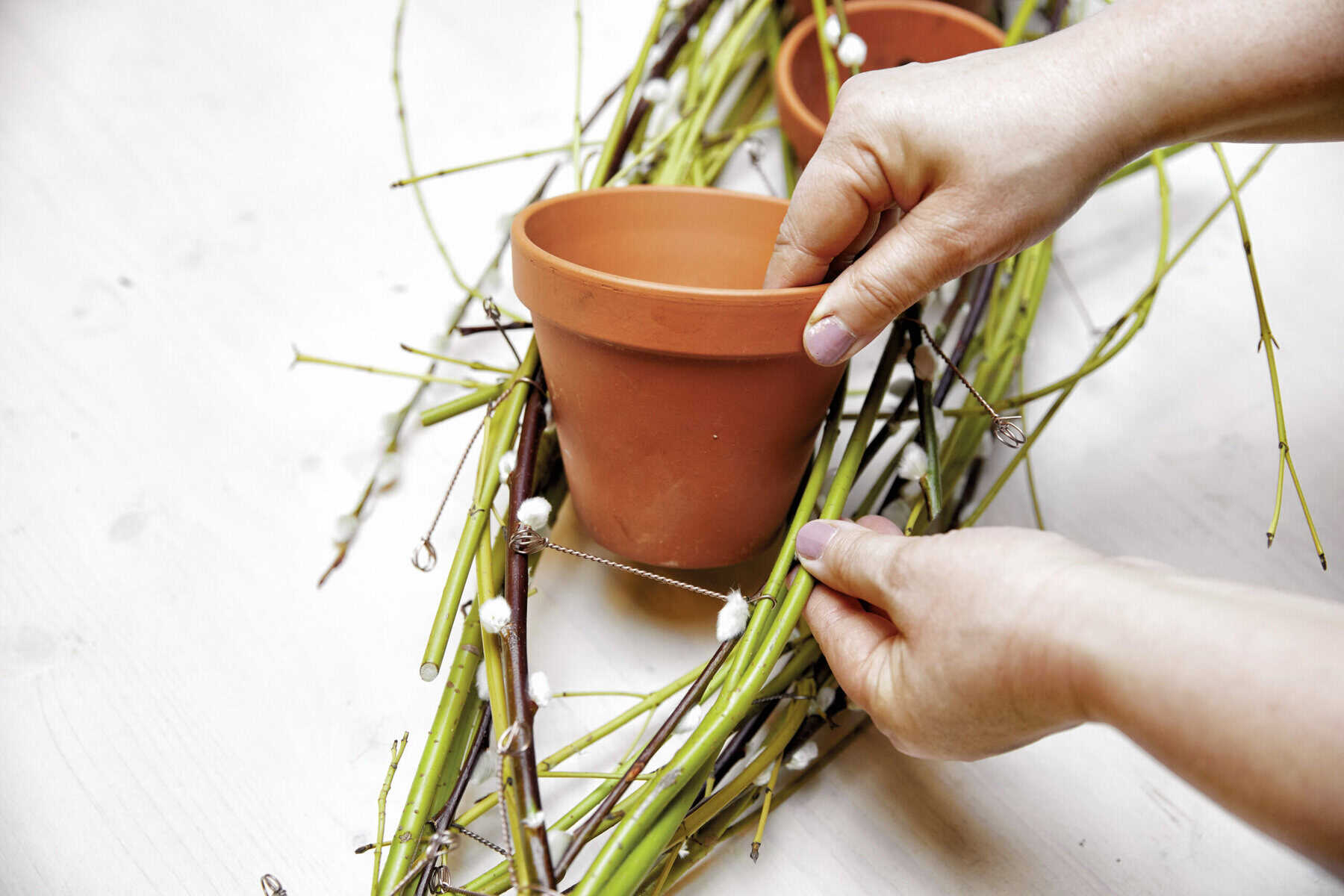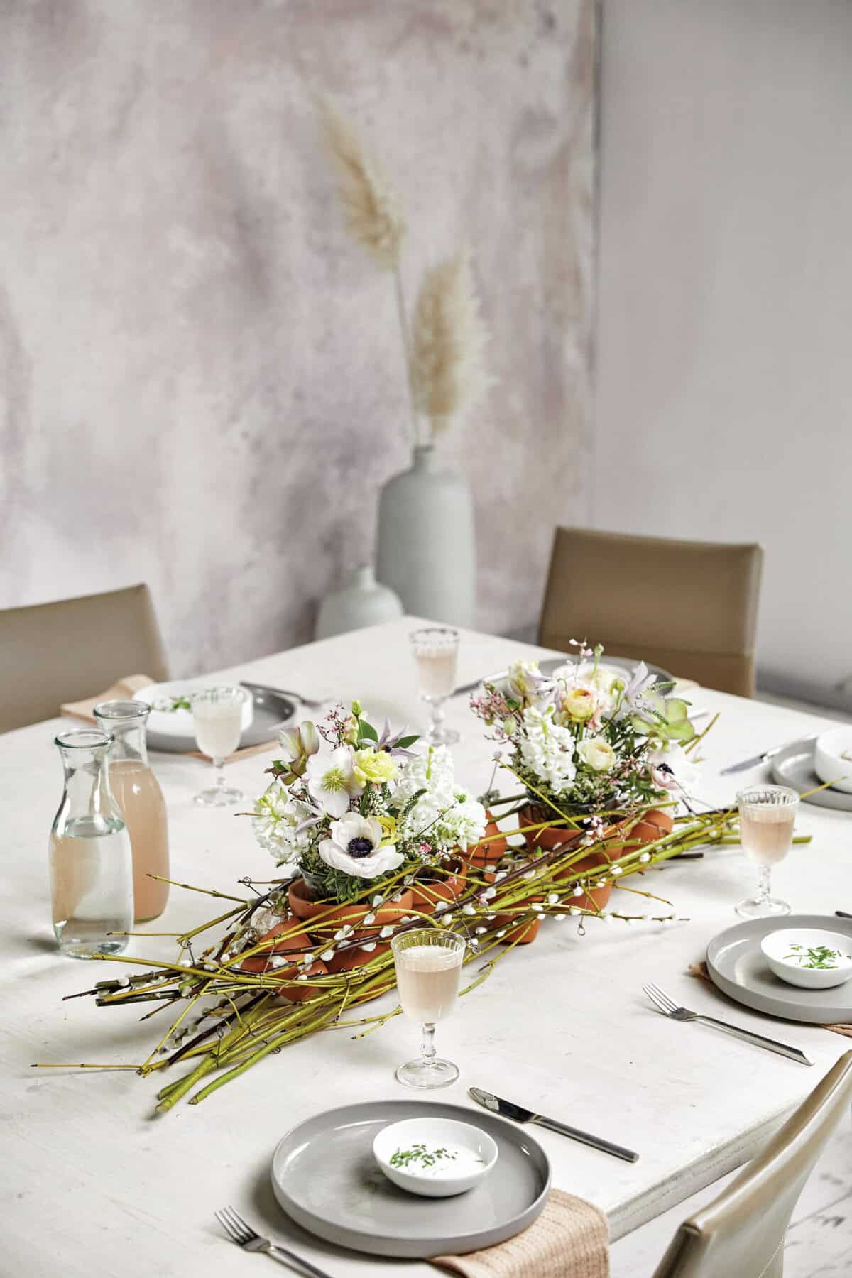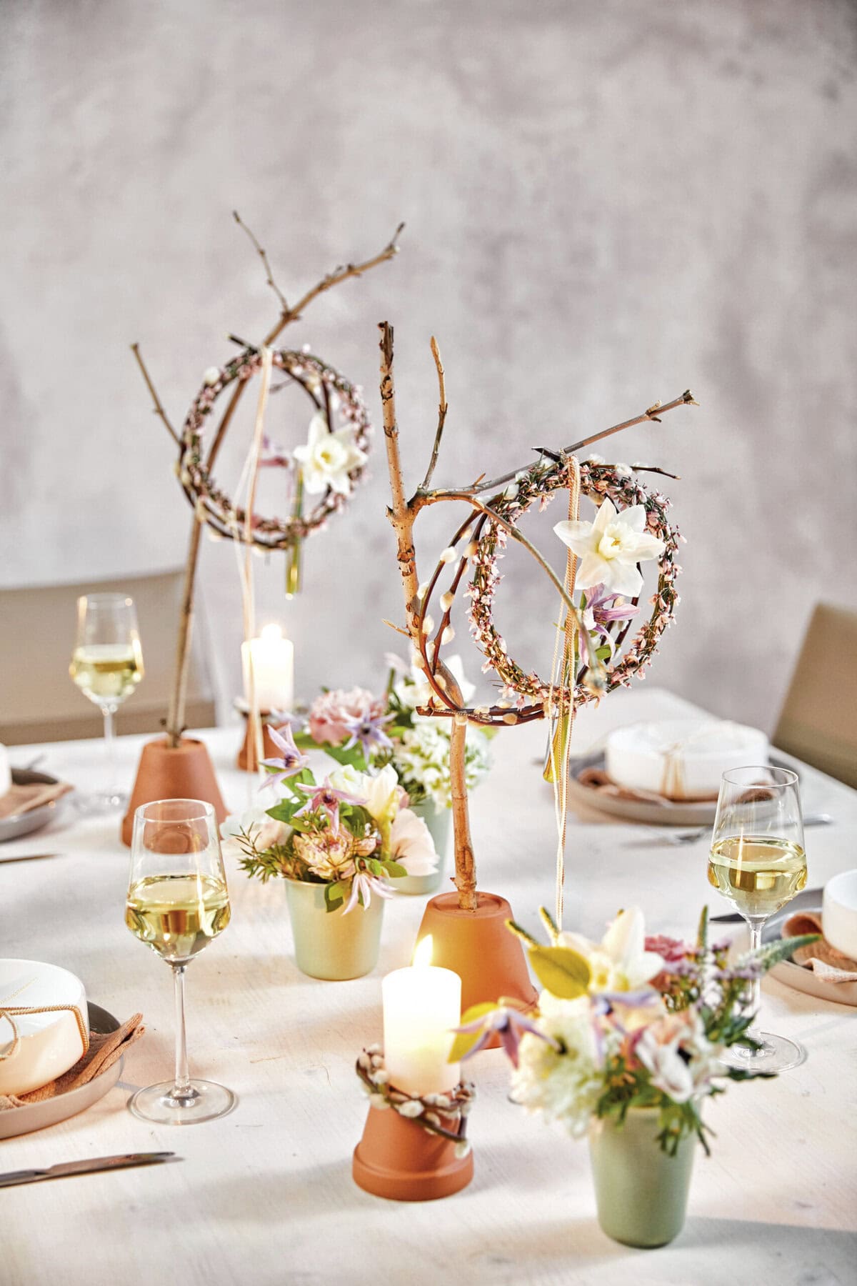 Die Natur auf den Tisch geholt: Kahle Zweige, die in umgedrehten Tontöpfen Halt finden, wirken wie kleine Bäumchen. Geschmückt werden sie von gewunden Kränzchen aus Weidenkätzchen- und Retamastrauchzweigen. Mittig setzen jeweils Narzissen- und Clematis-Blüten, die in Glasröhrchen frischgehalten werden, blühende Blickpunkte.