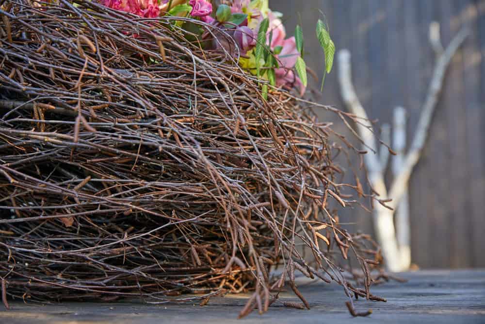 Die Basis dieses üppigen Frühlingsblütengestecks ist ein Drahtkorb, der auf eine Holzscheibe geschraubt ist. Er wird füllig und dick mit angedrahteten Birkenzweigen versehen, die auch untereinander mit Twistdraht fixiert sind. Die eingesetzte und gewässerte Frischblumensteckschaum-Schale sorgt für eine gute Haltbarkeit der eingesteckten Frühlingsblumen.