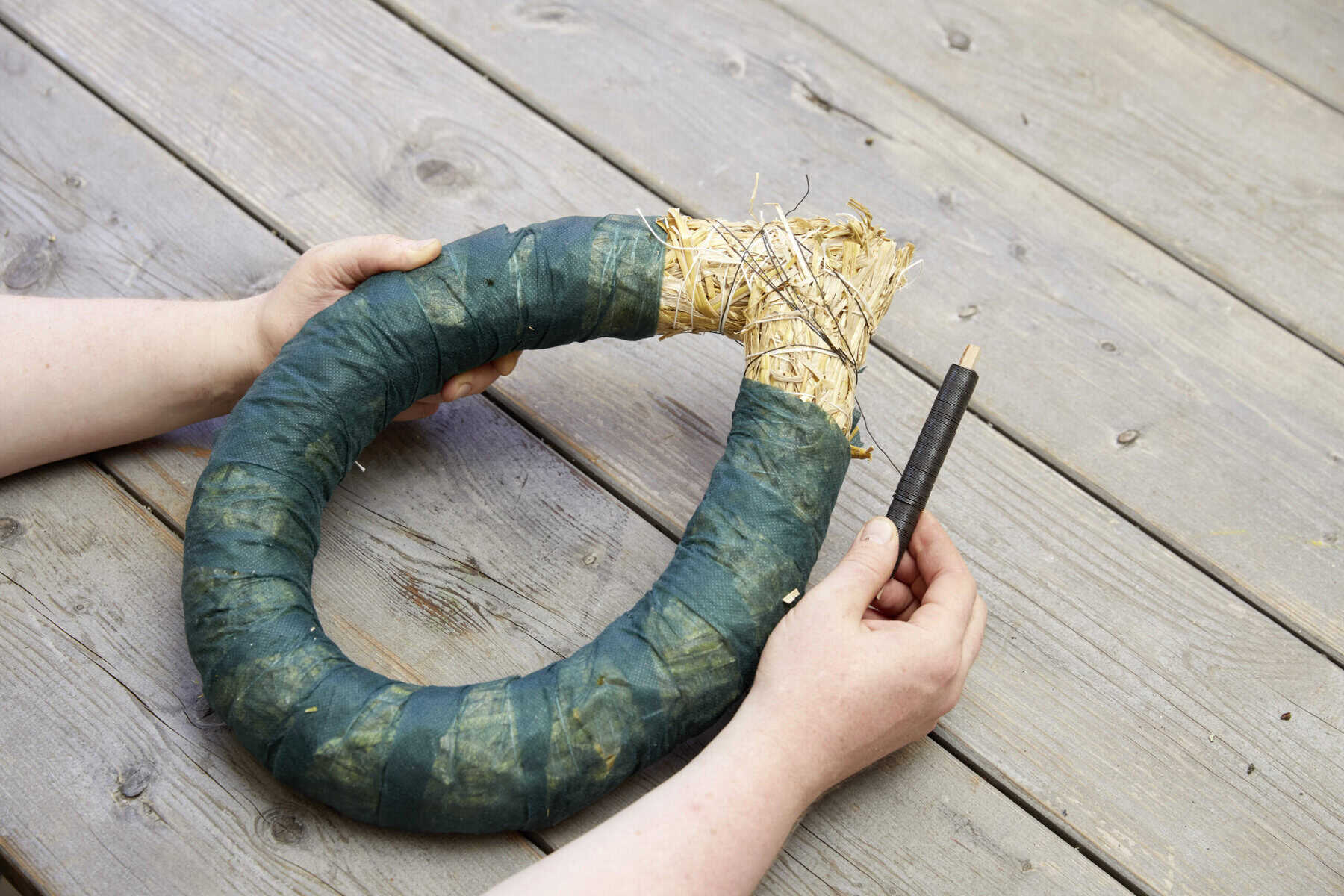 Den Strohkranz aufschneiden und zu einem Tropfen formen, dabei die Spitze mit Wickeldraht fixieren. Splittstäbe als Ablage für die gewässerte Steckschaumunterlage durch die Tropfenform stecken und diese mittig platzieren. Die Tropfenform mittels Efeunadeln mit Flechtenzweigen bestecken und die Floralien einarbeiten.