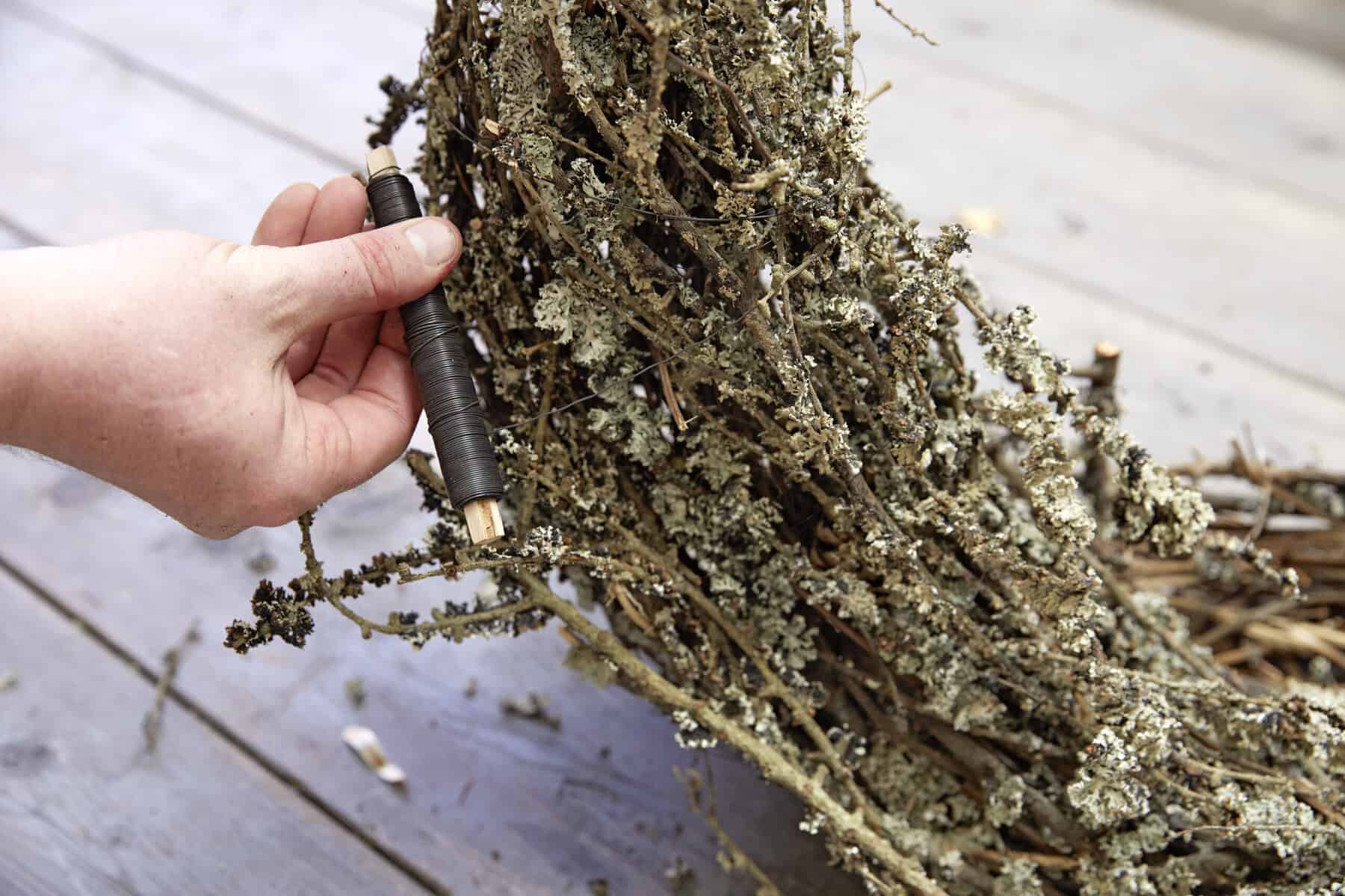 Die Ranken zu einem sichelförmigen Grundgerüst zusammenbinden. Die Flechtenzweige in das Grundgerüst einarbeiten und mit Draht umwickeln. Dann die gewässerte Frischblumensteckschaum-Kugel in das Gerüst einklemmen und die Werkstoffe einarbeiten.