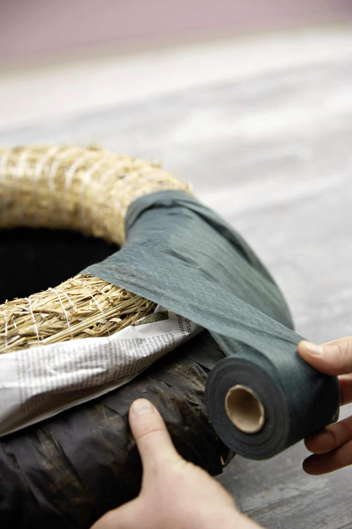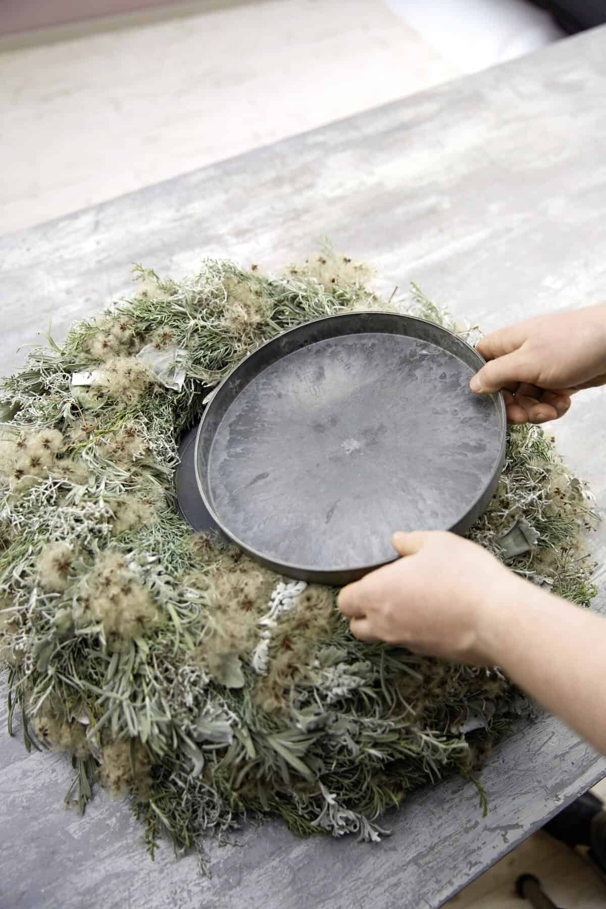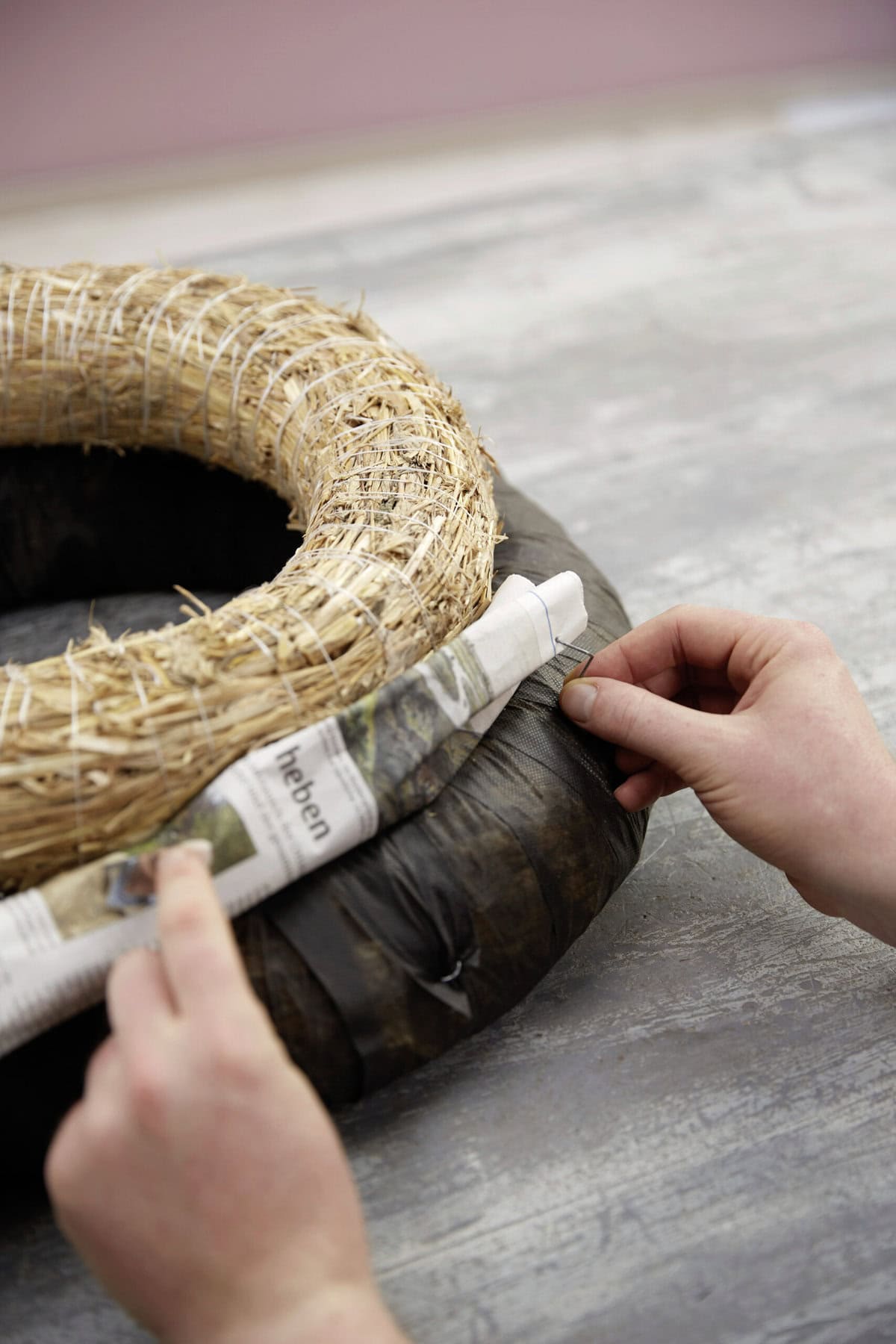 Legt zunächst zwei oder mehr Strohrömer unterschiedlicher Größe übereinander, sodass sie eine Deichform ergeben. Den Übergang zwischen den Kränzen kaschiert angehaftetes Zeitungspapier. Fixiert alles mit Kranzband. Nun verschiedene pflanzliche Materialien – zum Beispiel Zweige, Trockenblumen oder Gräser – rund um den Kranz legen und mit Wickeldraht sorgfältig befestigen. In der Mitte des Kranzes einen passenden Untersetzer platzieren. Darauf Kerzen in unterschiedlicher Höhe stellen, um ein lebendiges Gesamtbild zu erzeugen. Abschließend den Kranz mit Dekoelementen wie Kugeln, Sternen und Schmuckband verzieren.