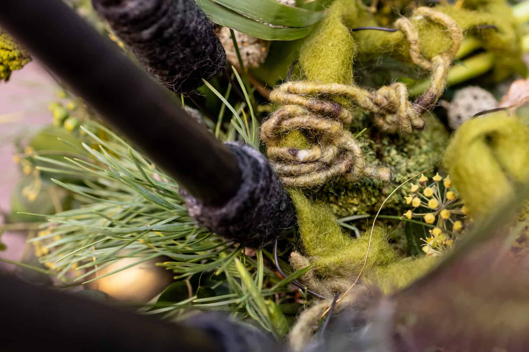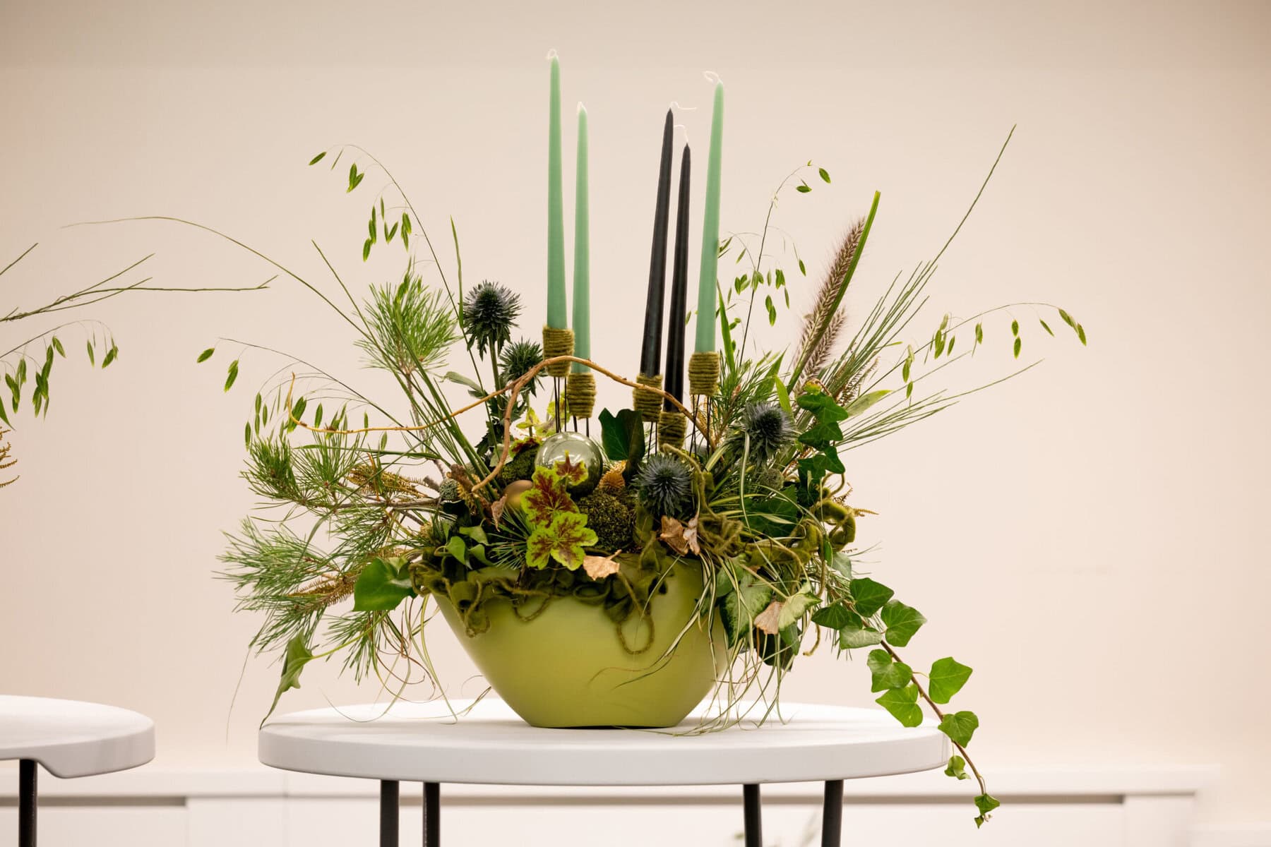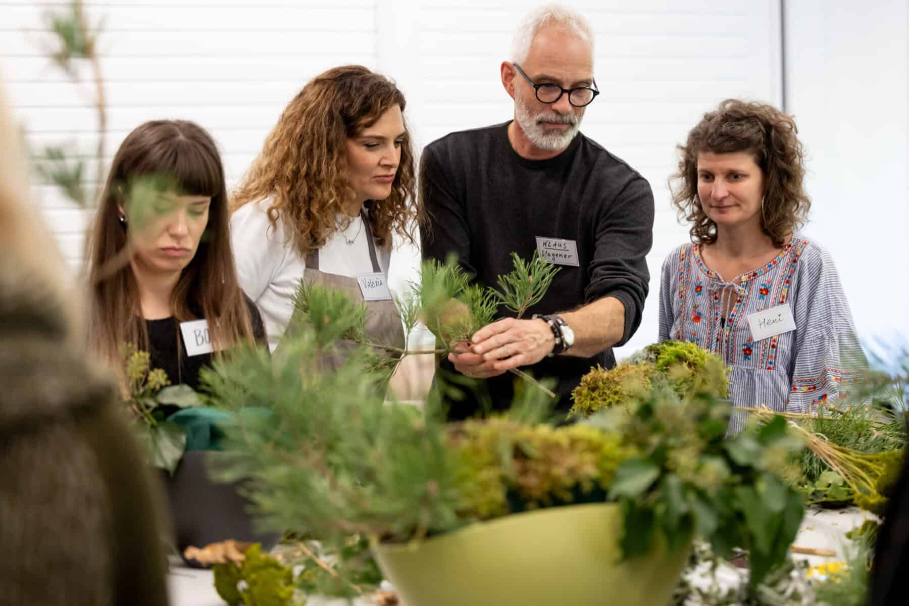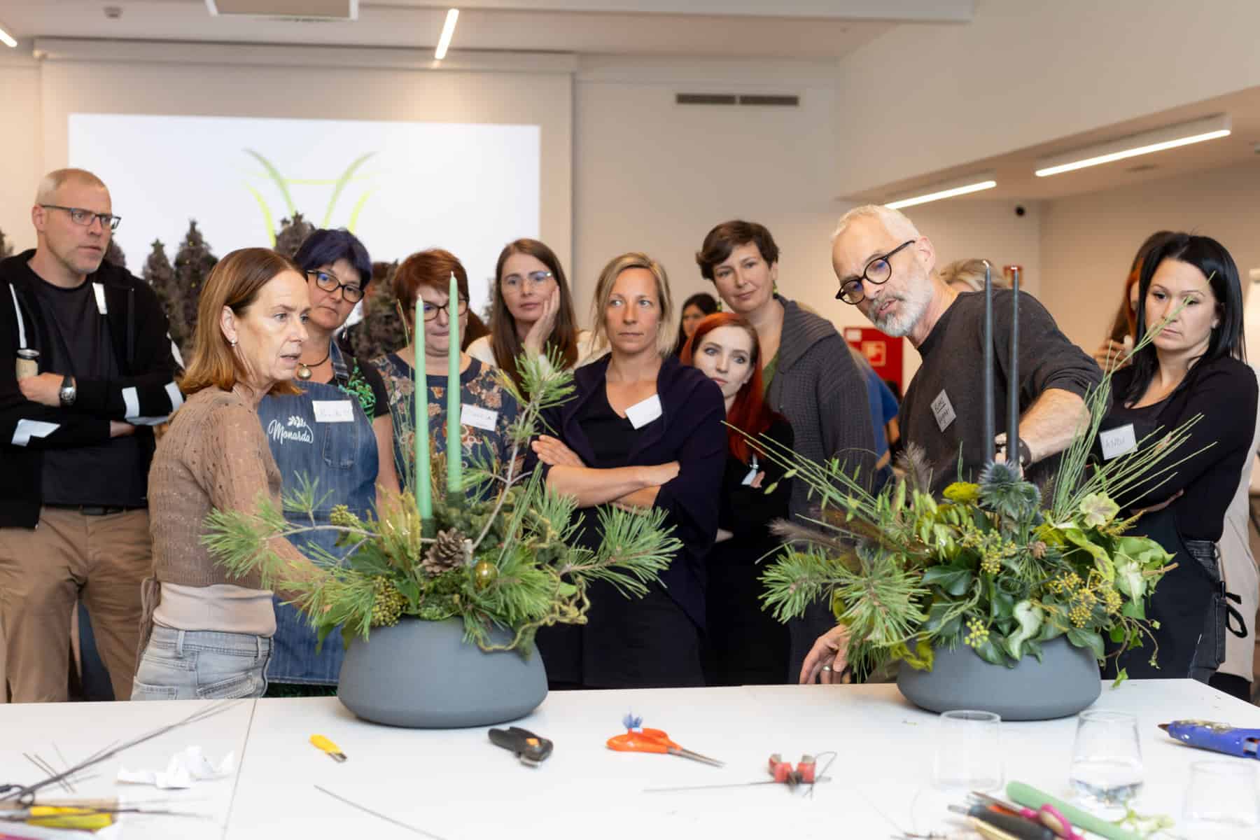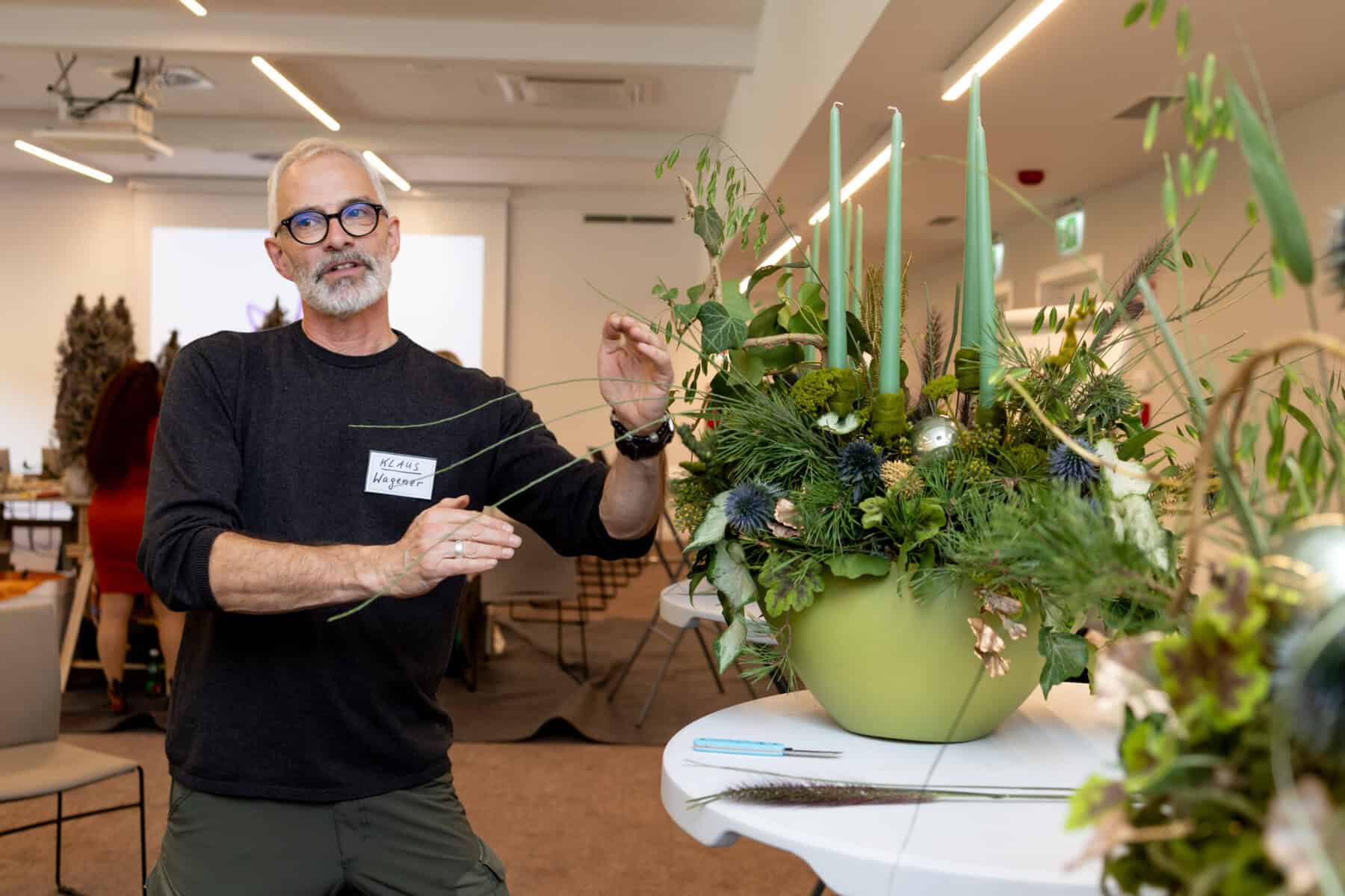 Die Gestecke und Arrangements zeigen, wie vielseitig und hochwertig rein grüne Farbwelten wirken können – von zarten Tischdekorationen über elegante Kränze bis hin zu modernen, freien Interpretationen. Alle Werkstücke wurden von den Workshop-Teilnehmer*innen sowie von Klaus Wagener selbst gestaltet – mit einem besonderen Fokus auf Struktur, Textur und Natürlichkeit.