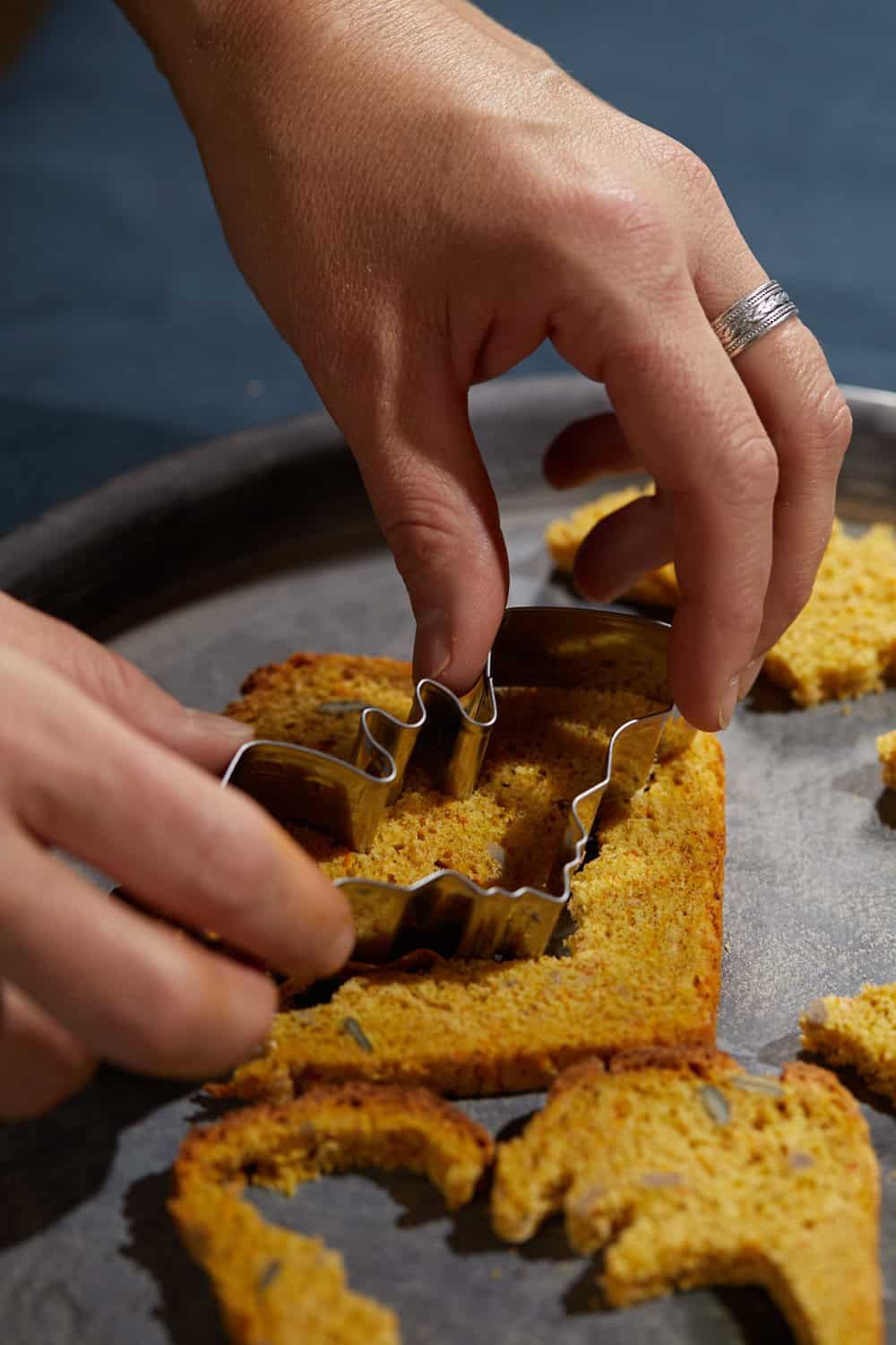 1. Das Kürbiskernbrot entsprechend der Anleitung (springe zum Rezept) zubereiten und mit Fledermausformen ausstechen.
