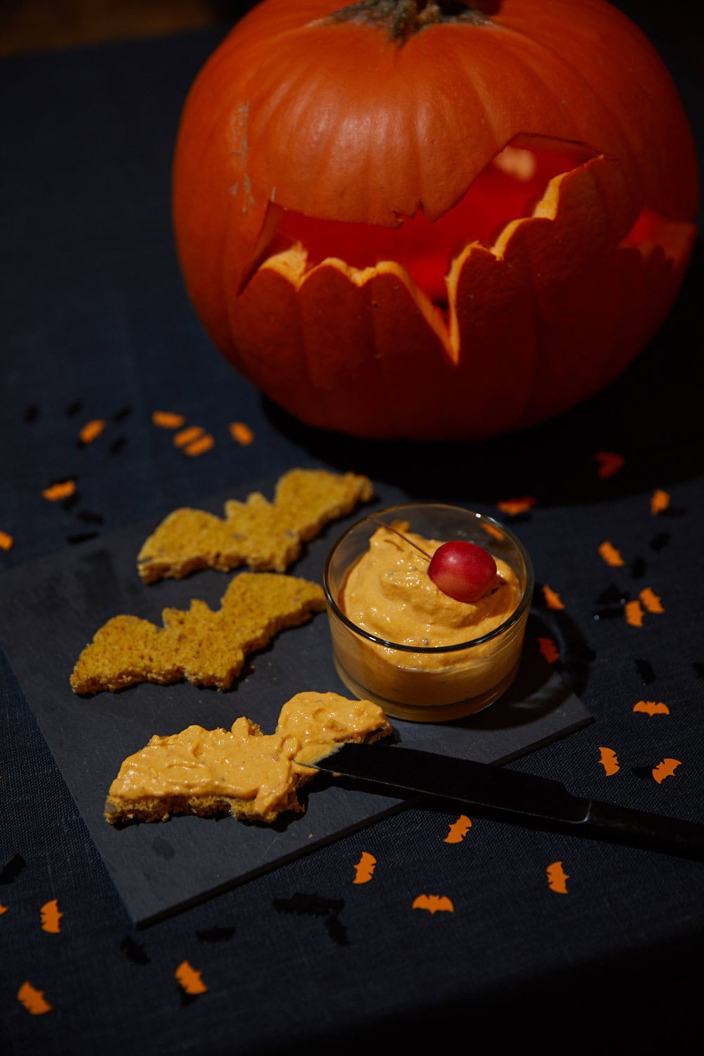3. Für das Pesto Kürbiskerne in einer Pfanne ohne Öl anrösten. Knoblauchzehen pellen, kleinschneiden und zusammen mit den gerösteten Kernen und anderen Zutaten in einem Mixer oder mit dem Pürierstab zu einer feinen Masse verarbeiten. Den geschnitzten Kürbis auf einen flachen Teller setzen und das Pesto bis zur Mitte des offenen Mundes einfüllen, sodass es auch aus dem Mund des Kürbisgesichts herausfließt. Dieses zu dem Fledermausbrot reichen.