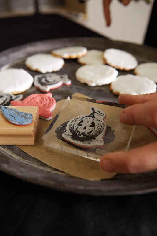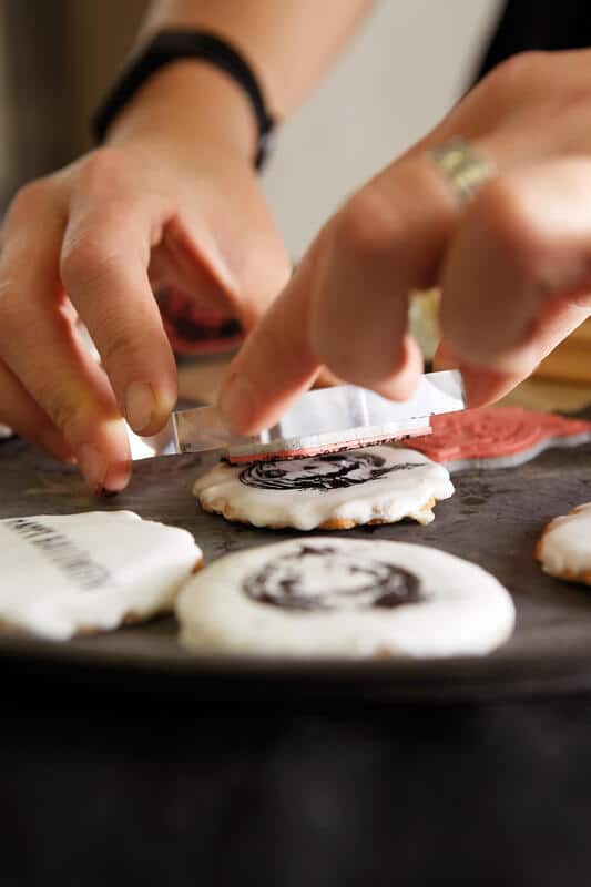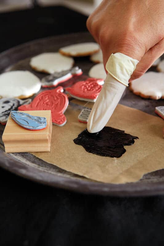 Für das Stempelmotiv die Lebensmittelfarbe auf einem Schwammtuch verteilen und den Stempel vorsichtig darauf drücken. Danach auf den gut getrockneten Zuckerguss drücken. Das bedarf ein wenig Übung, wird Euch aber schnell gelingen!