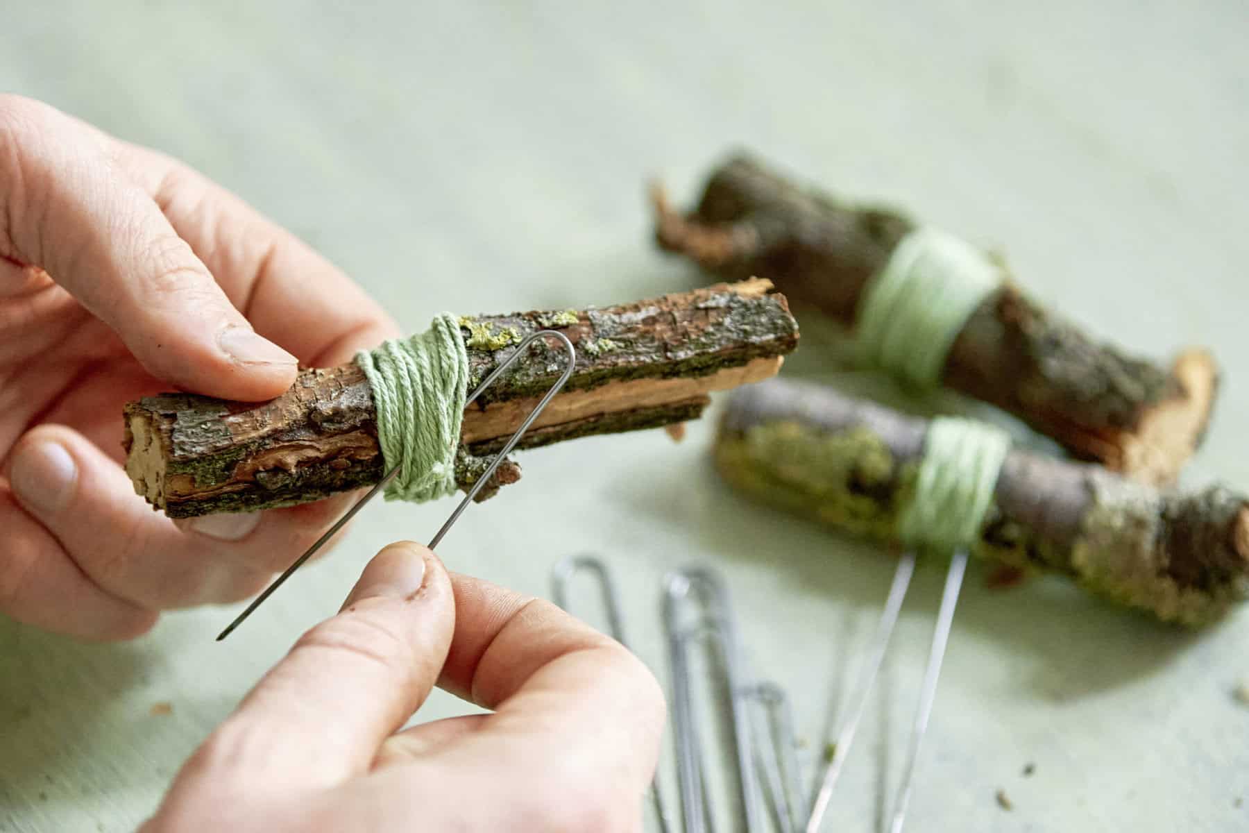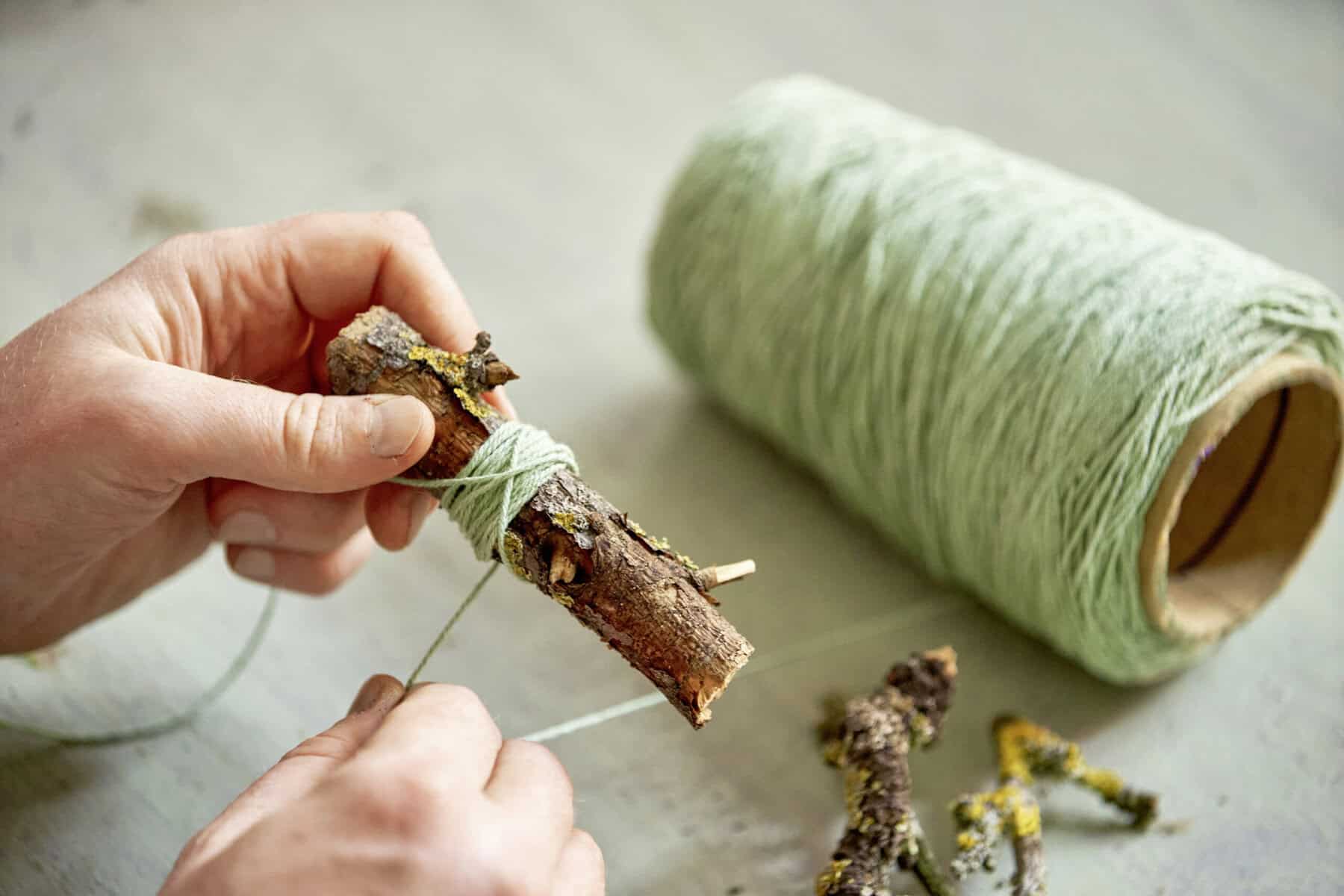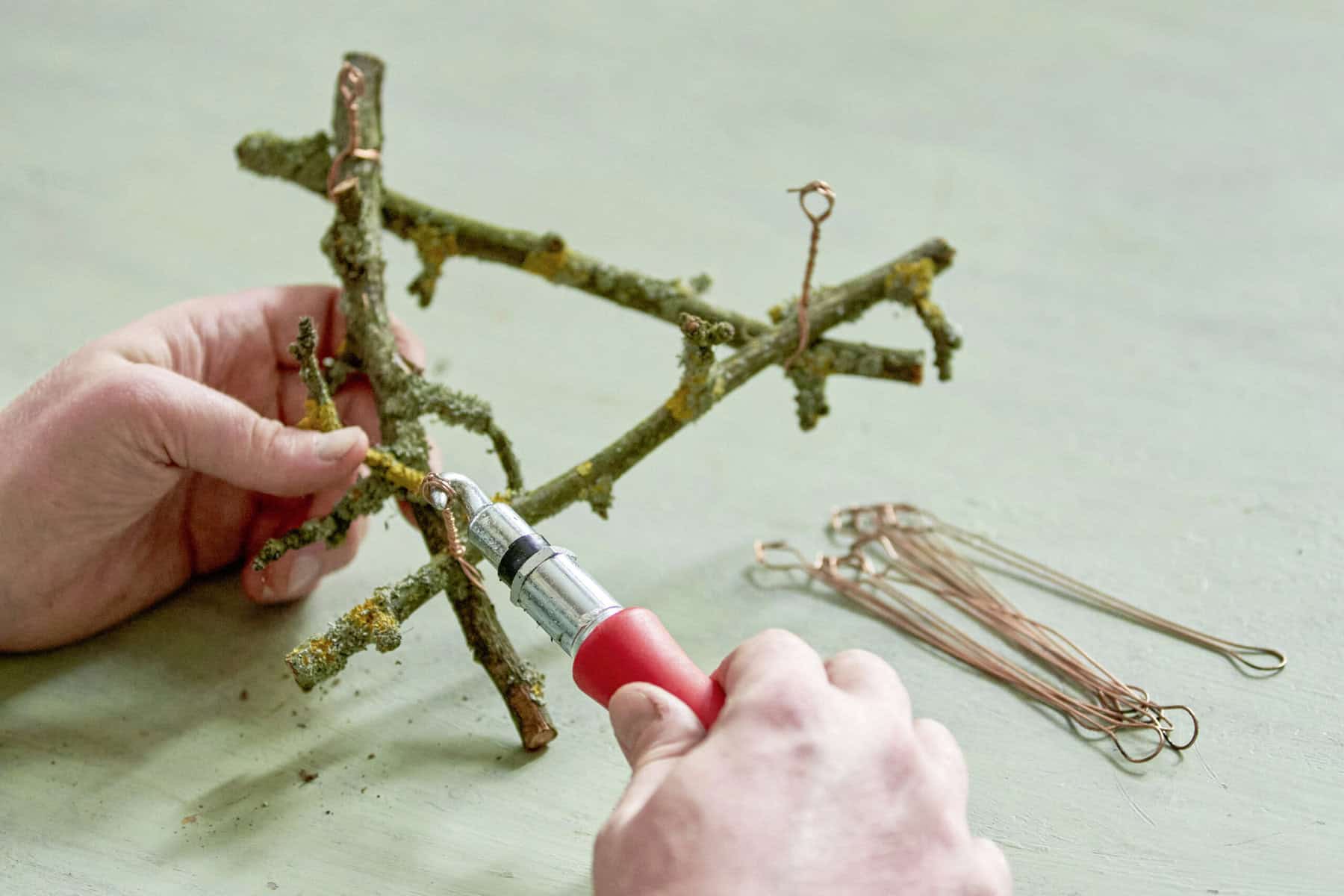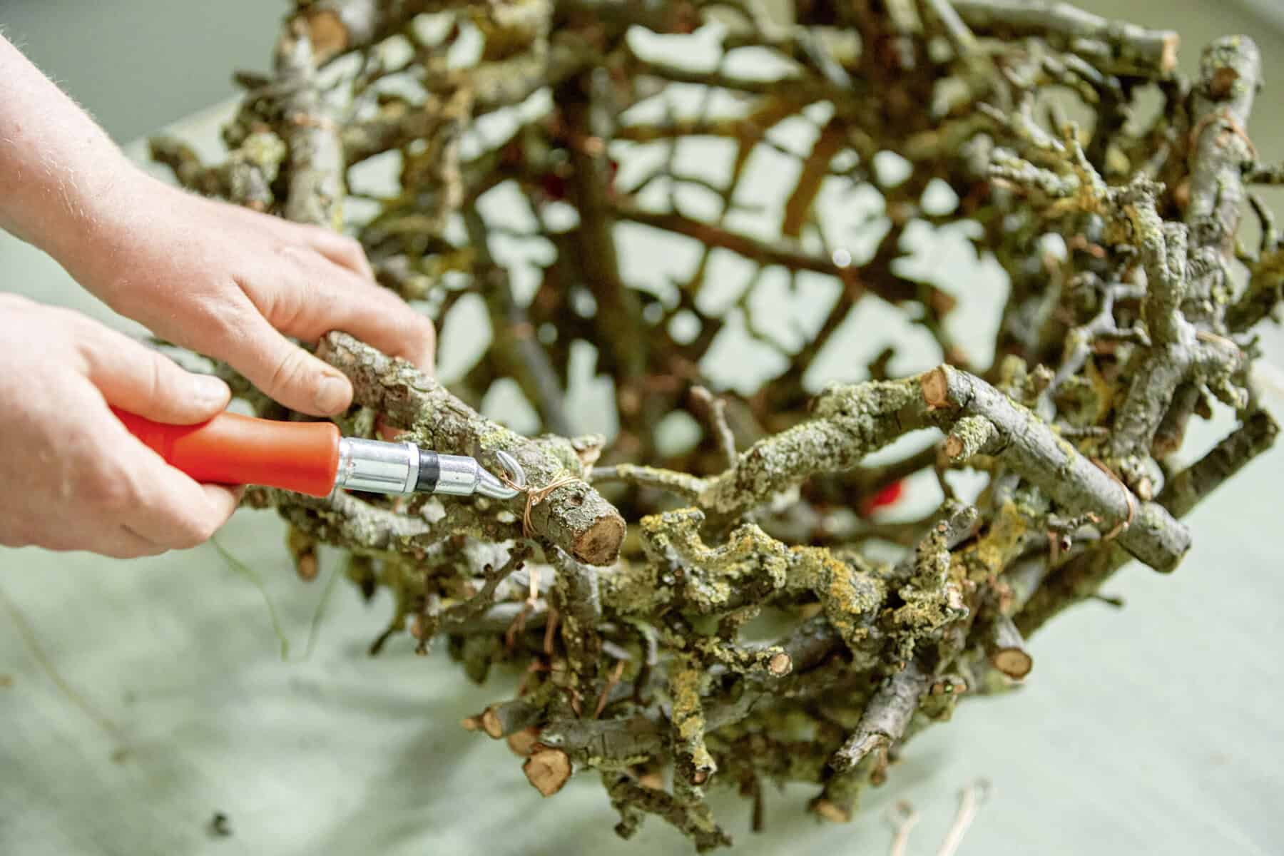 Aus Zweigstücken mithilfe von Twister und Twistdraht ein Dreieck formen. Weitere Zweige an diesem Dreieck befestigen und den Vorgang so lange wiederholen, bis ein korbartiges Grundgerüst entstanden ist. Dabei immer weitere Zweige einarbeiten, damit sich das Gerüst noch oben hin weitet. Den gewässerten Steckschaum einsetzen und die verschiedenen Floralien dicht an dicht einstecken. Zum Schluss Äpfel so platzieren, dass sie nicht durchrutschen. Wer mag, kann sie jeweils auf einen Holzstab stecken und in den Steckschaum einstecken. Bei Bedarf einen Geschenkanhänger am Zweiggerüst anbringen.