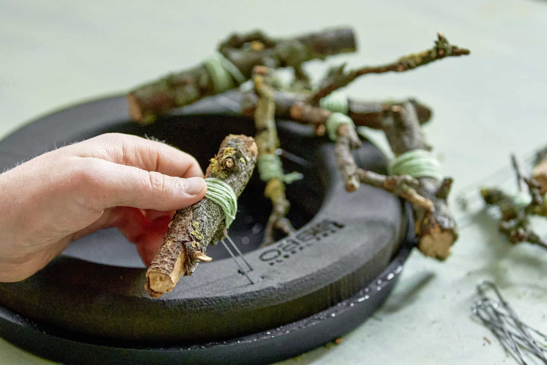 Den Frischblumensteckschaum-Kranz wässern. In der Zwischenzeit die Obstbaumzweige in Stücke schneiden und einen Teil der Zweige mit Schnur umwickeln. Dann Haften zwischen das Zweigstück und die Schnur schieben und anschließend ringsherum im Steckschaum verankern. Im Anschluss die verschiedenen Blüten einarbeiten und farblich passende Äpfel in der Kranzmitte platzieren. Wer mag, kann noch einen Geschenkanhänger anbringen.