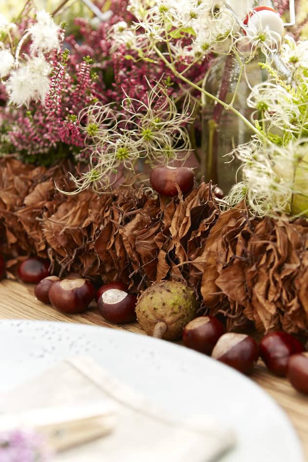 Die Holzkisten mit Heide und Waldrebe bepflanzen. Anschließend einige Flaschen dazwischen stellen, mit Wasser füllen und Blüten von Dahlien oder anderen saisonalen Blumen darin platzieren. Die Buchenblätter auf Draht auffädeln und zur Dekoration als Kette auf den Tisch legen. Schließlich mit herbstlichen Früchten wie Äpfeln, Kastanien, Eicheln und Bucheckern dekorieren. Die Blüten in den Flaschen können bei Bedarf regelmäßig ausgetauscht werden, sodass ihr besonders lange Freude an der herbstlichen Tischdekoration haben könnt.
