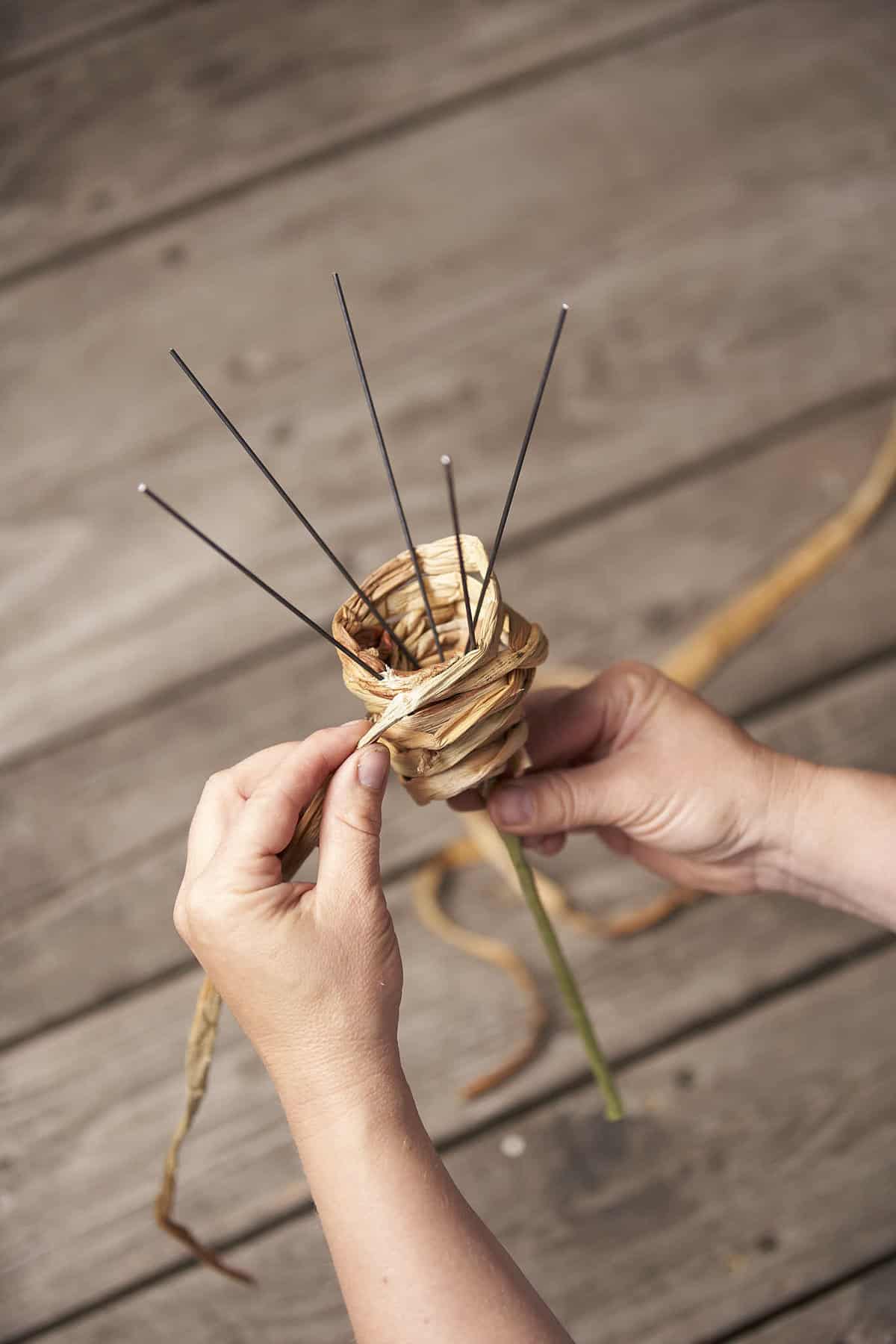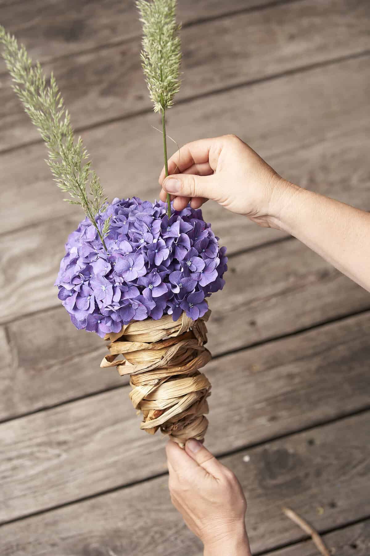 Den Steckdraht zusammenfassen und mit Flower Tape umwickeln. Dann den Steckdraht auseinanderbiegen und eingeweichte Wasserhyazinthen-Stränge durch die Verstrebungen hindurchweben, sodass eine „Tüte“ entsteht. Die Floralien durch die Grundform stecken, zum Strauß binden und in eine wassergefüllte Vase stellen.