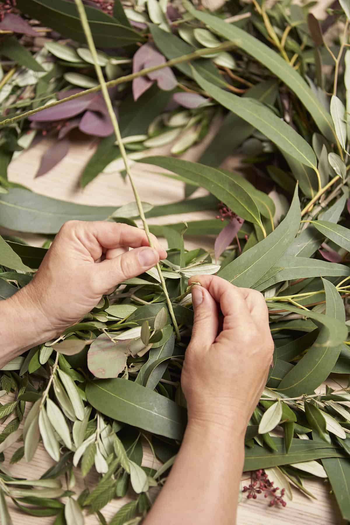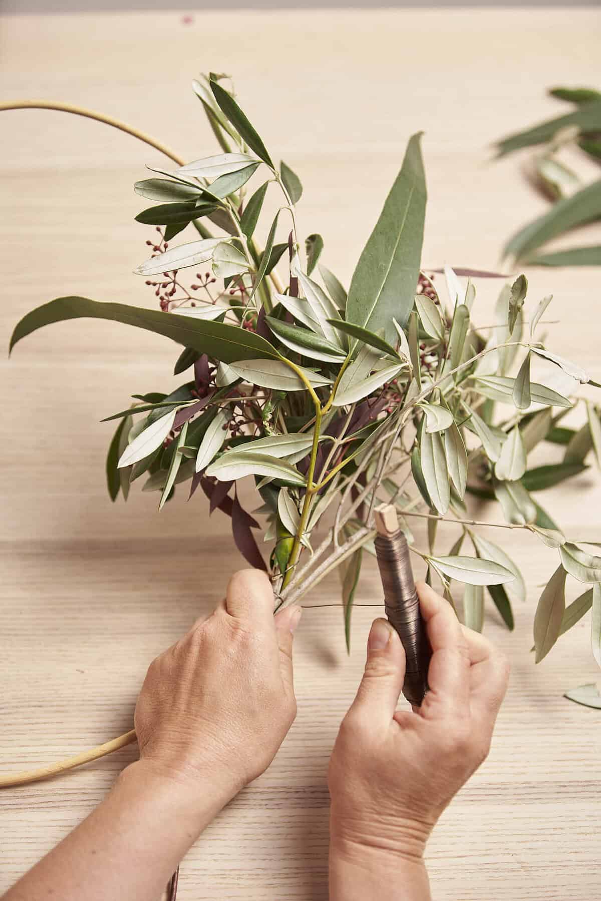 Clematis-Ranken zum Kranz winden und mit Bindedraht fixieren. Steckdrähte mit Kunststofftape umwickeln und an der alternativen Steckhilfe befestigen. Floralien durch die alternative Steckhilfe zum Strauß binden und in eine wassergefüllte Vase stellen.