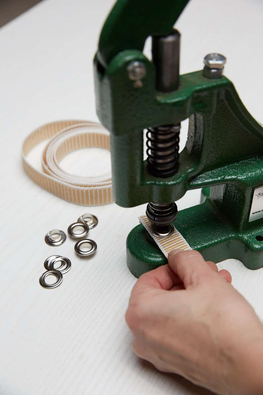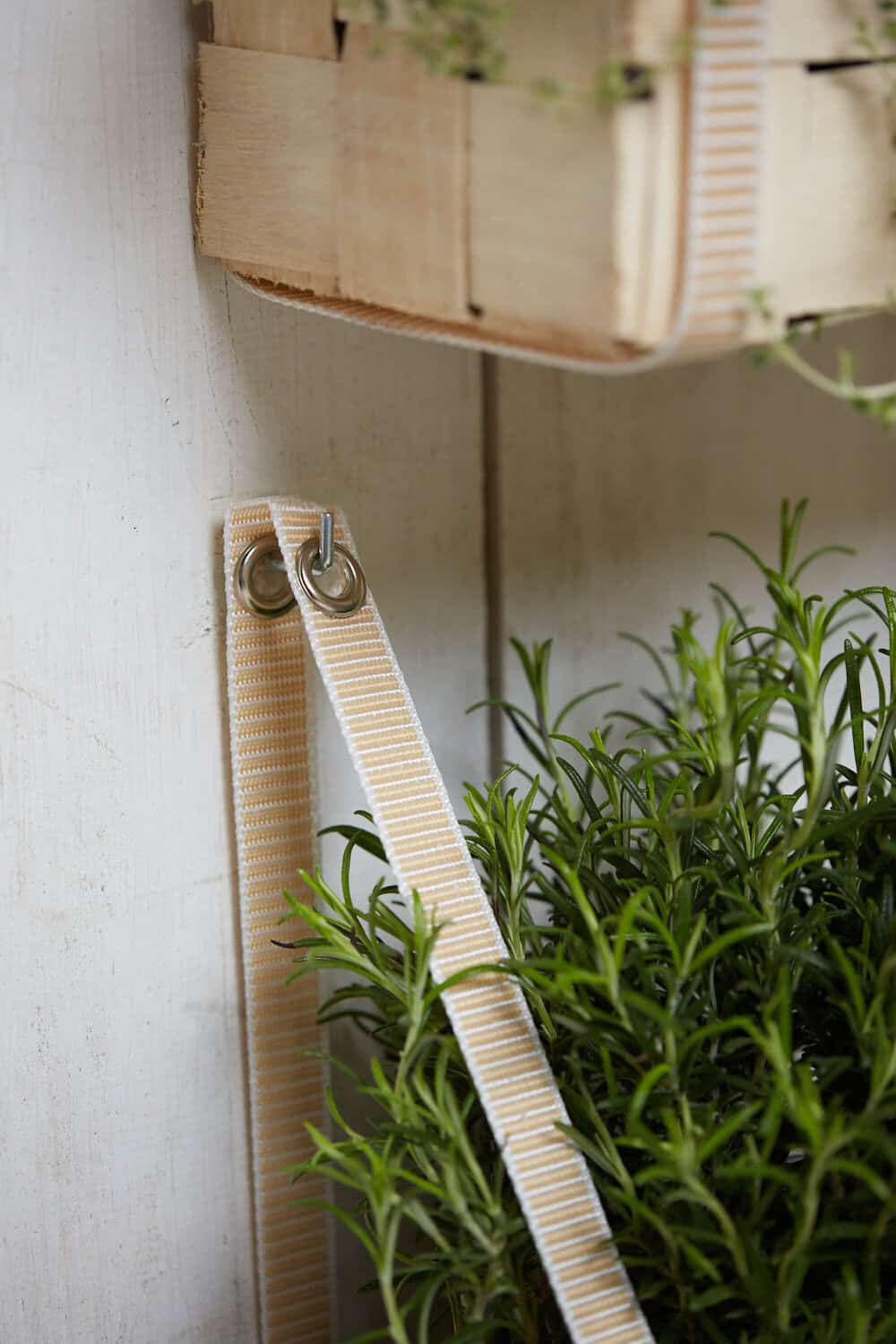 Textilgurte passend zurechtschneiden und an den Enden mit Nietösen versehen. Dann mit den Bändern die Kisten an Schraubhaken in der Wand aufhängen. Kisten mit Folie auslegen und mit Kräutern bepflanzen.