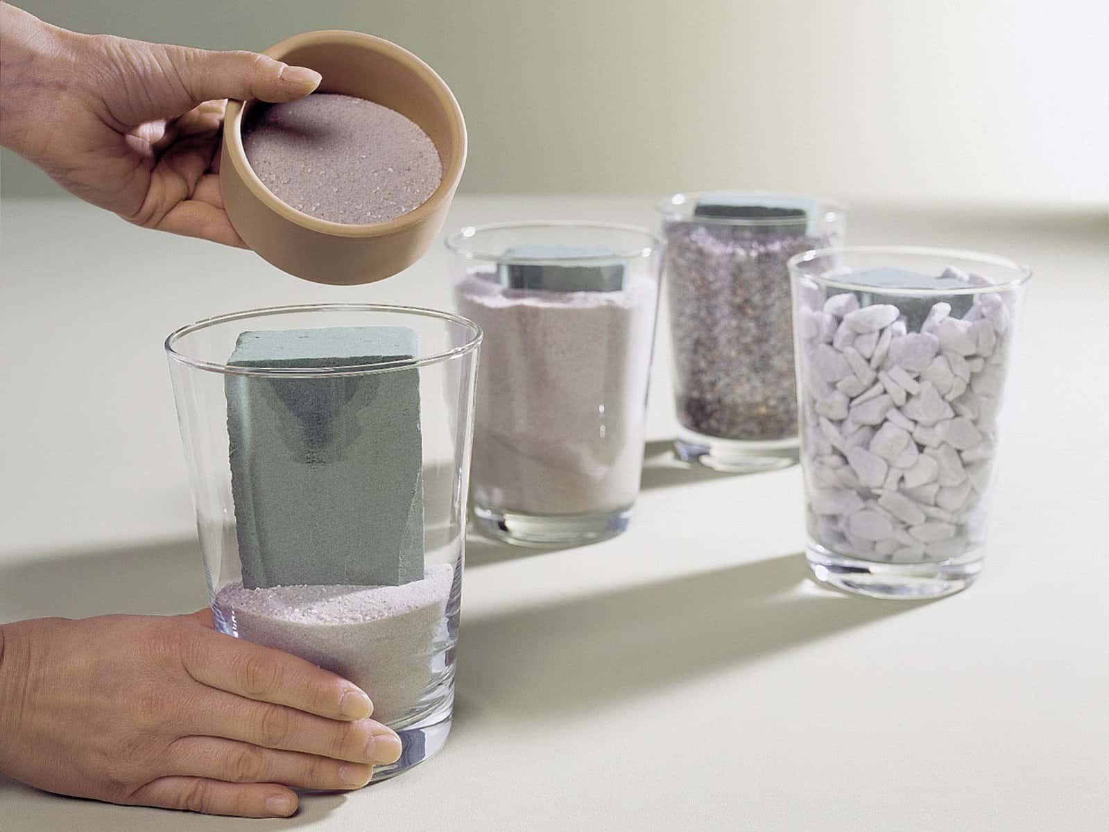 1. Bei durchsichtigen Glasgefäßen besteht die Notwendigkeit, den Steckschaumblock allseitig zu kaschieren. Steine, Sand und Granulate sind Beispiele für einsetzbare Materialien. Auch Werkstoffe wie Blätter und Früchte sind denkbar. Wichtig ist dabei, dass sie für die Zeit der Haltbarkeit des Gestecks ein Eintauchen in Wasser vertragen und das Wasser nicht durch Fäulnis verderben oder verfärben.