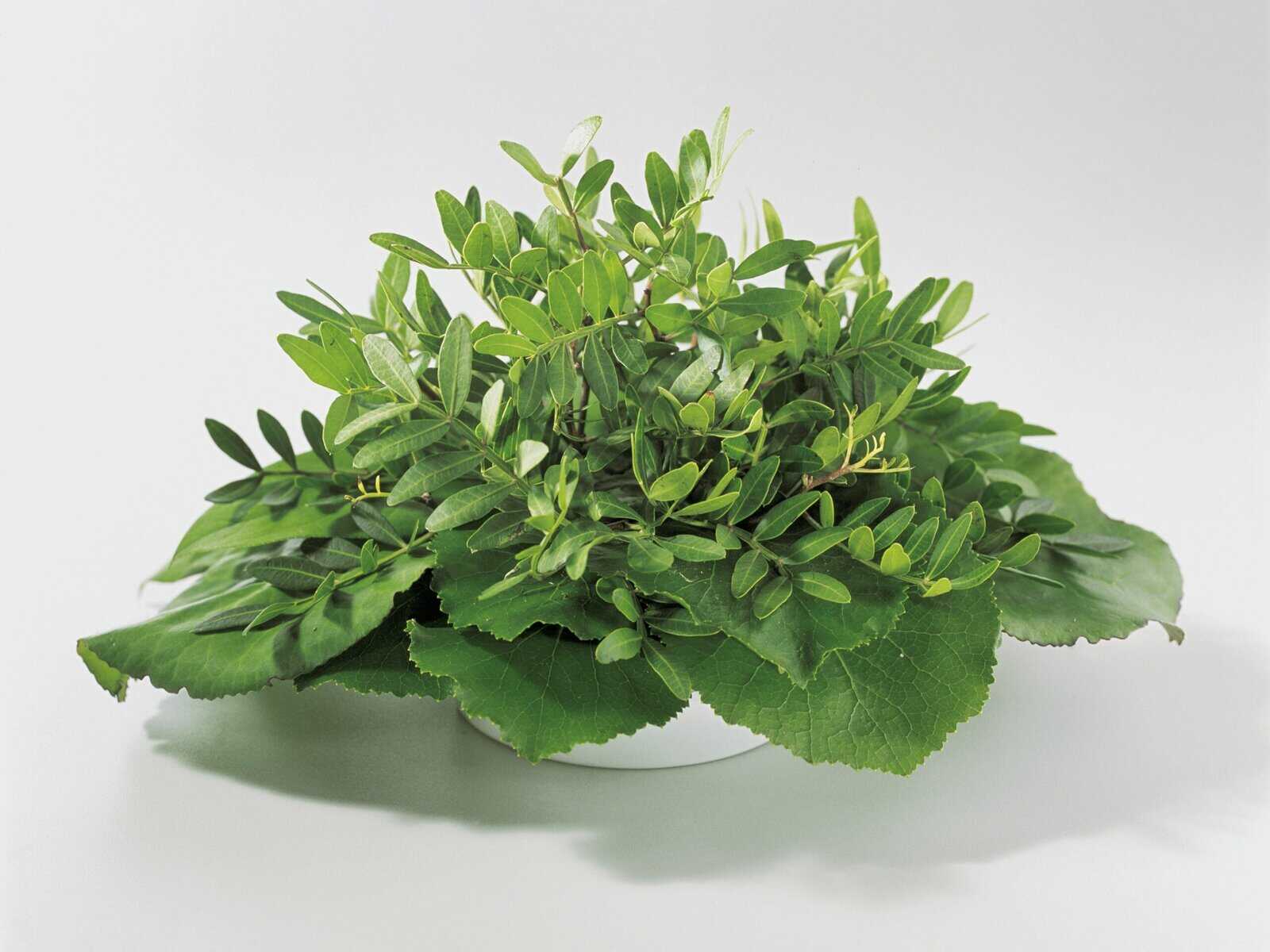 3. Bei dekorativen Gestecken ist zunächst ein Verdecken des Randbereichs der Basis mit größeren, flächigen Blättern sinnvoll. Durch die Verwendung verschiedener Blatt- und Grünarten mit ihren Bewegungsformen ergeben sich bereits wirkungsvolle Gestaltungseffekte.