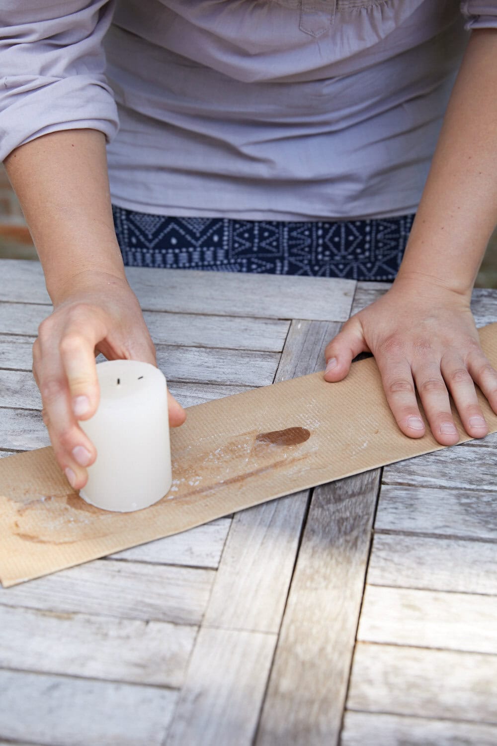 Zunächst das Packpapier so zuschneiden, dass es einmal um einen Kräutertopf gewickelt werden kann. Für die brüchig wirkende Oberfläche eine weiße Kerze über das Papier reiben.