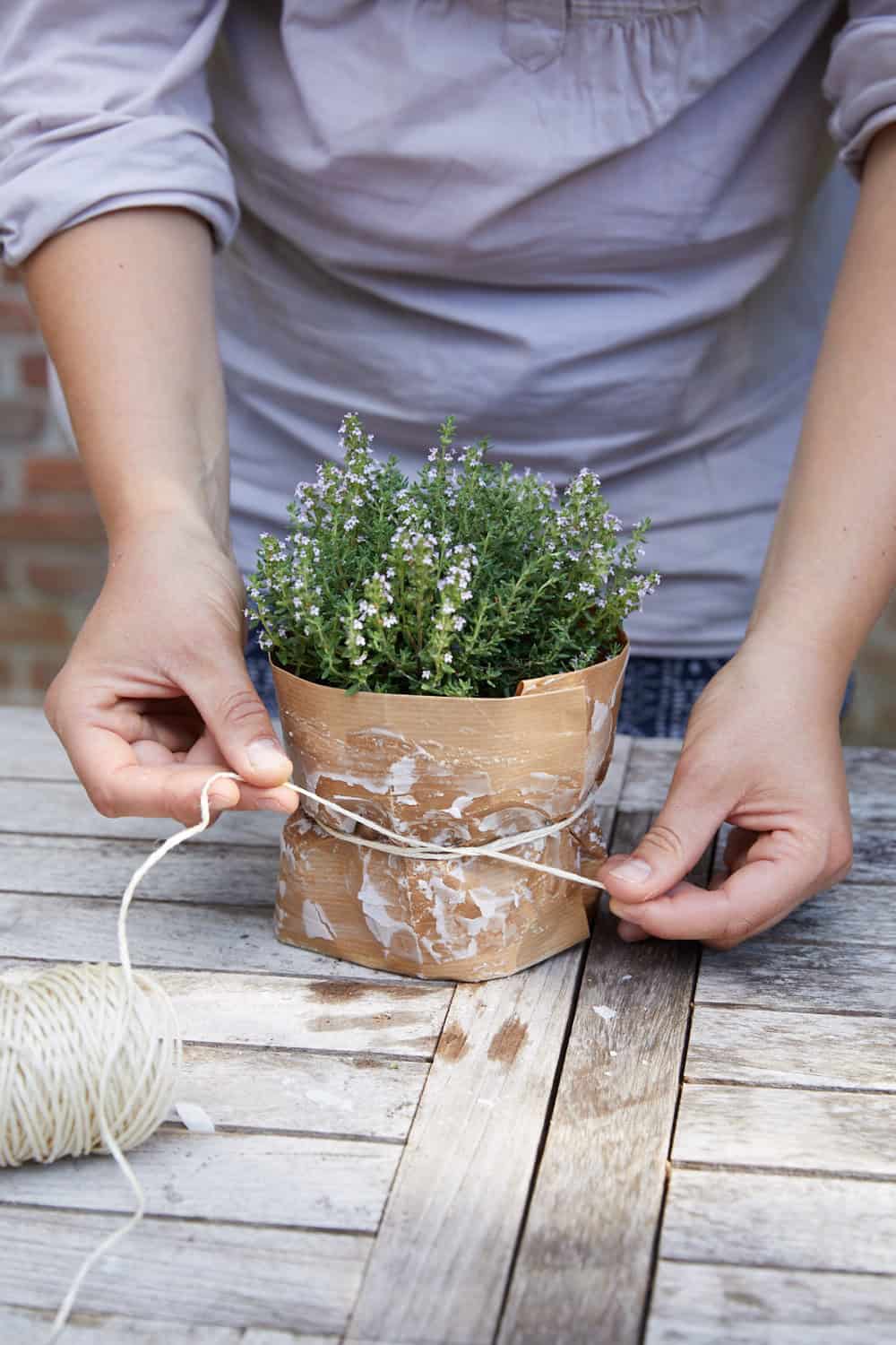 Diesen Schritt so oft wiederholen, bis es Euch gefällt. Dann das Papier um den Topf wickeln und mit Kordel fixieren. Übrigens: Es macht gar nichts, wenn dabei das Papier knittert.