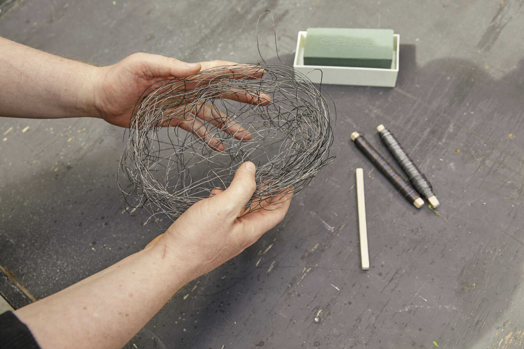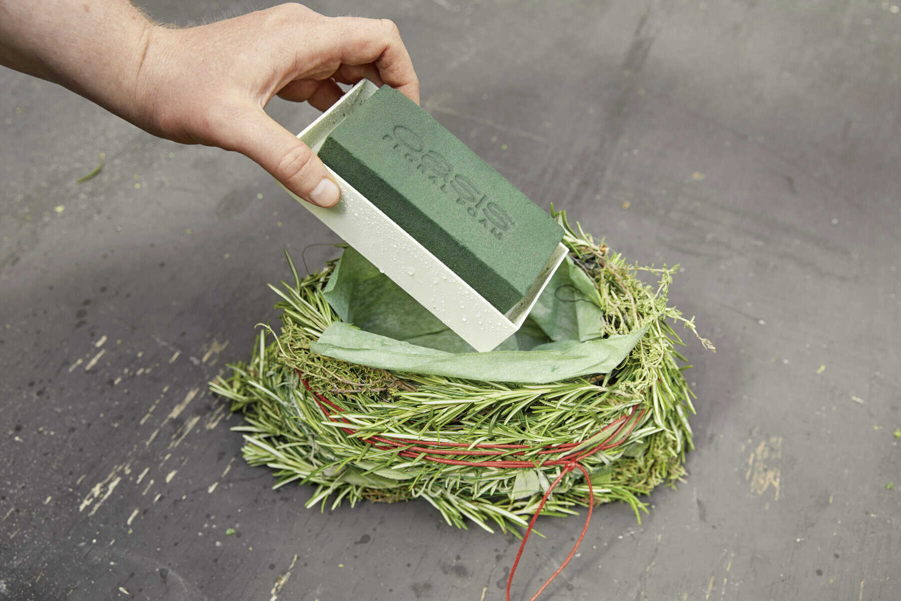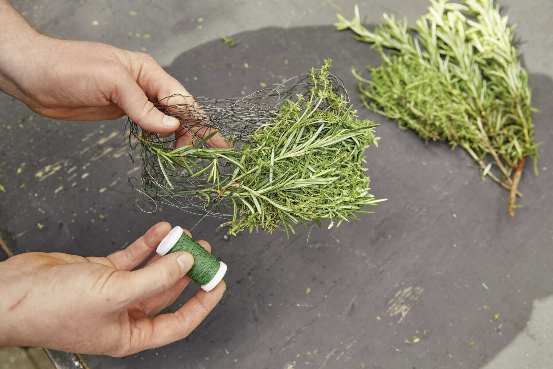Den Wickeldraht nach und nach abspulen und zu einem schalenähnlichen Gefäß formen. Das Drahtgerüst mit den verschiedenen Kräutern dicht bewickeln, bevor der gewässerte Frischblumensteckschaum