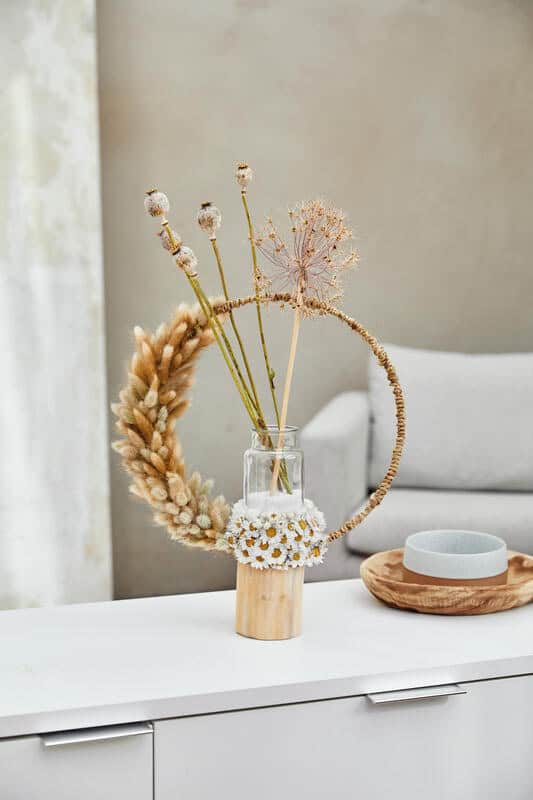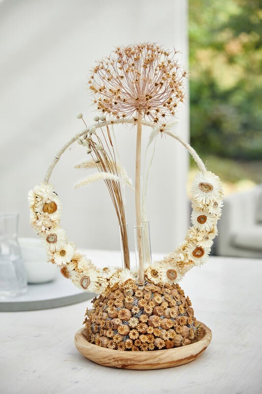 Eine schlichte Glasvase mittels Leim auf die passend geschnittene Steckmasse kleben und diesen unteren Bereich mit Strohblumen bekleben. Pinholder auf einen zylinderförmigen Holzklotz kleben. Den Wellendrahtring fest mit Kordel umwickeln und auf einer Seite mit Samtgras verzieren. Den fertigen Ring mit einem Nagel auf dem Holzklotz – mittig im Pinholder – befestigen. Die Vase auf den Pinholder stecken. Getrockneten Zierlauch und Mohnkapseln in die Vase stellen – fertig.