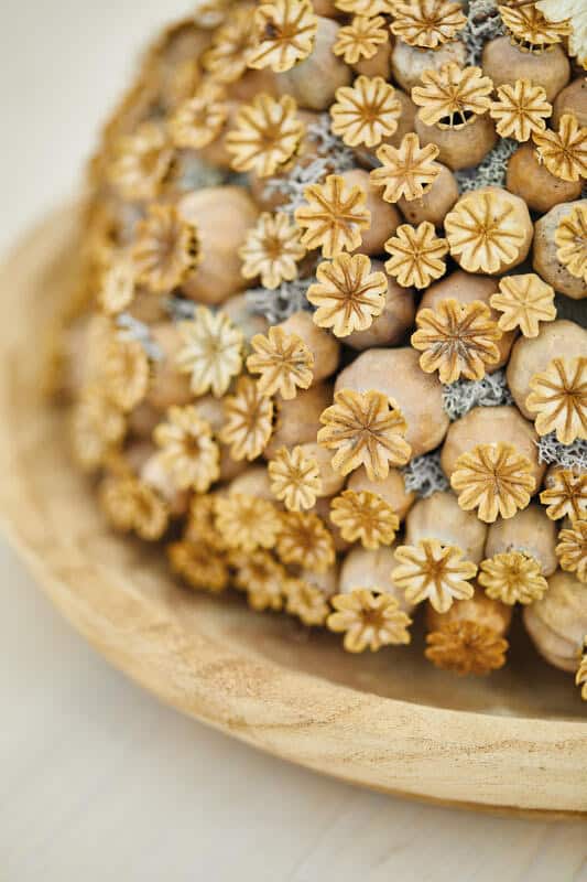 Einen Wellendrahtring vollständig mit Schnur umwickeln. Anschließend die untere Hälfte des Ringes dicht mit Strohblumen bekleben. Die Mohnkapseln in die halbrund geformte Steckmasse drücken. Die kleinen Zwischenräume