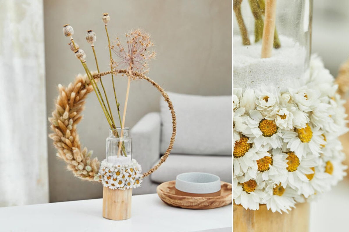 Eine schlichte Glasvase mittels Leim auf die passend geschnittene Steckmasse kleben und diesen unteren Bereich mit Strohblumen bekleben. Pinholder auf einen zylinderförmigen Holzklotz kleben. Den Wellendrahtring fest mit Kordel umwickeln und auf einer Seite mit Samtgras verzieren. Den fertigen Ring mit einem Nagel auf dem Holzklotz – mittig im Pinholder – befestigen. Die Vase auf den Pinholder stecken. Getrockneten Zierlauch und Mohnkapseln in die Vase stellen – fertig.