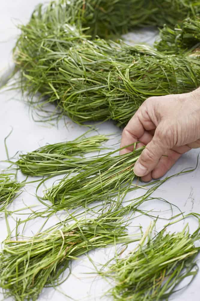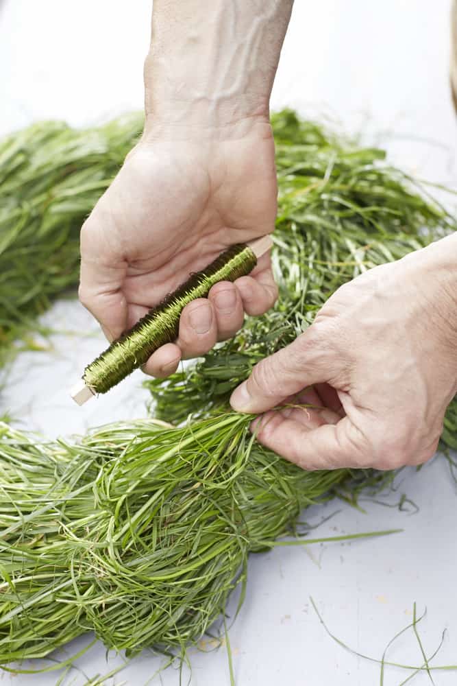 Zunächst Grasbündel in Schlaufen legen und mithilfe von Wickeldraht auf dem Strohrömer befestigen. Dabei die Bündel dicht an dicht anlegen, damit das komplette Stroh abgedeckt ist. Zuletzt einzelne Blüten einschieben.