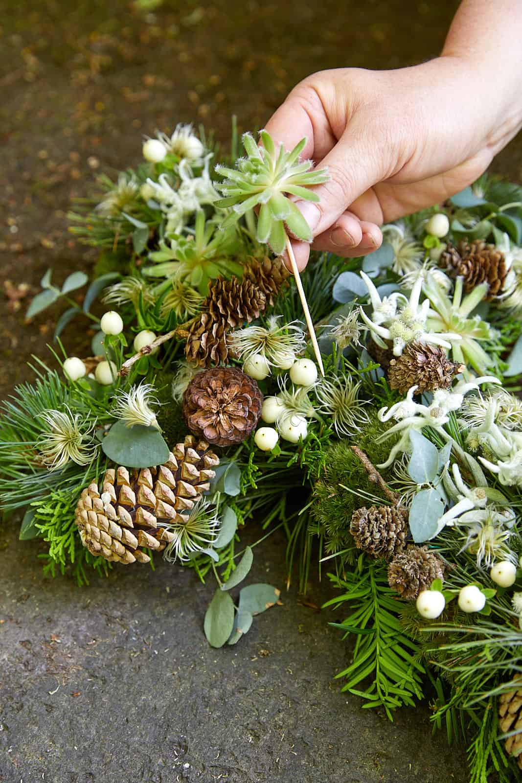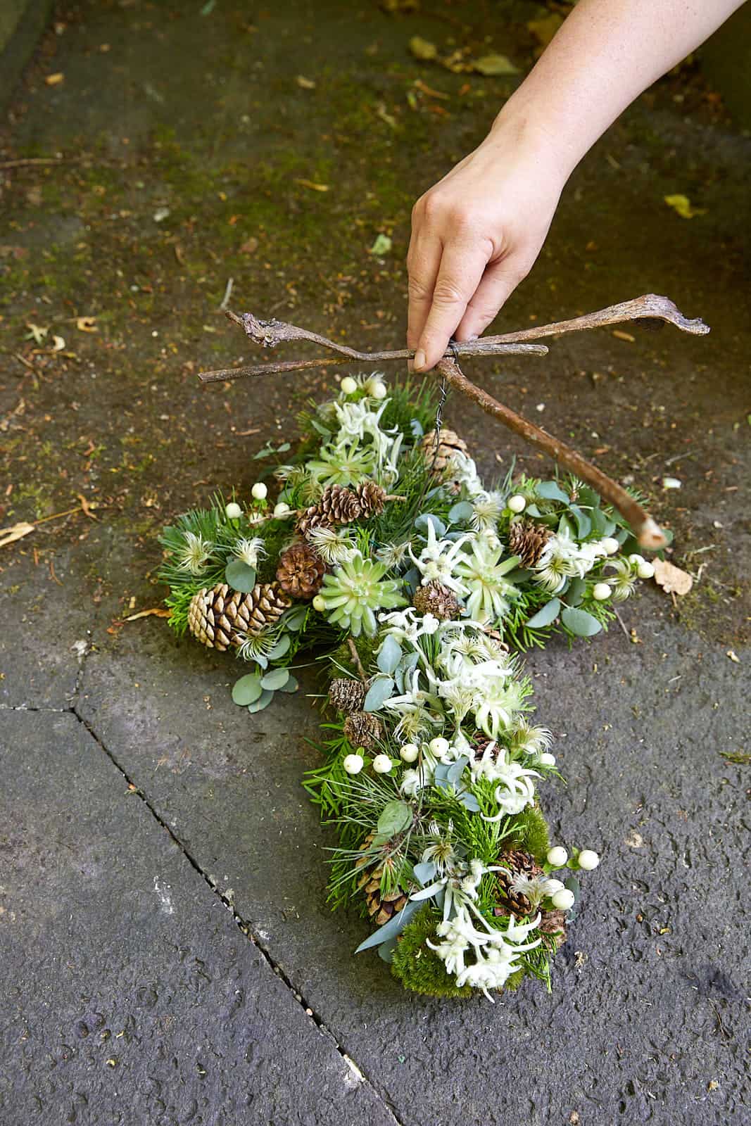 Den Kreuz-Frischblumensteckschaum wässern. Kleine Moos-Polster im Wurzelbereich mit Myrtendraht umwickeln, andrahten und in die Unterlage stecken. Die anderen Floralien hinzufügen. Sempervivum austopfen und einzelne Rosetten mittels Holzspießchen ebenfalls in die Steckbasis stecken. Aus Geweihholz ein Kreuz fertigen, dieses auflegen und auf der Steckunterlage fixieren.