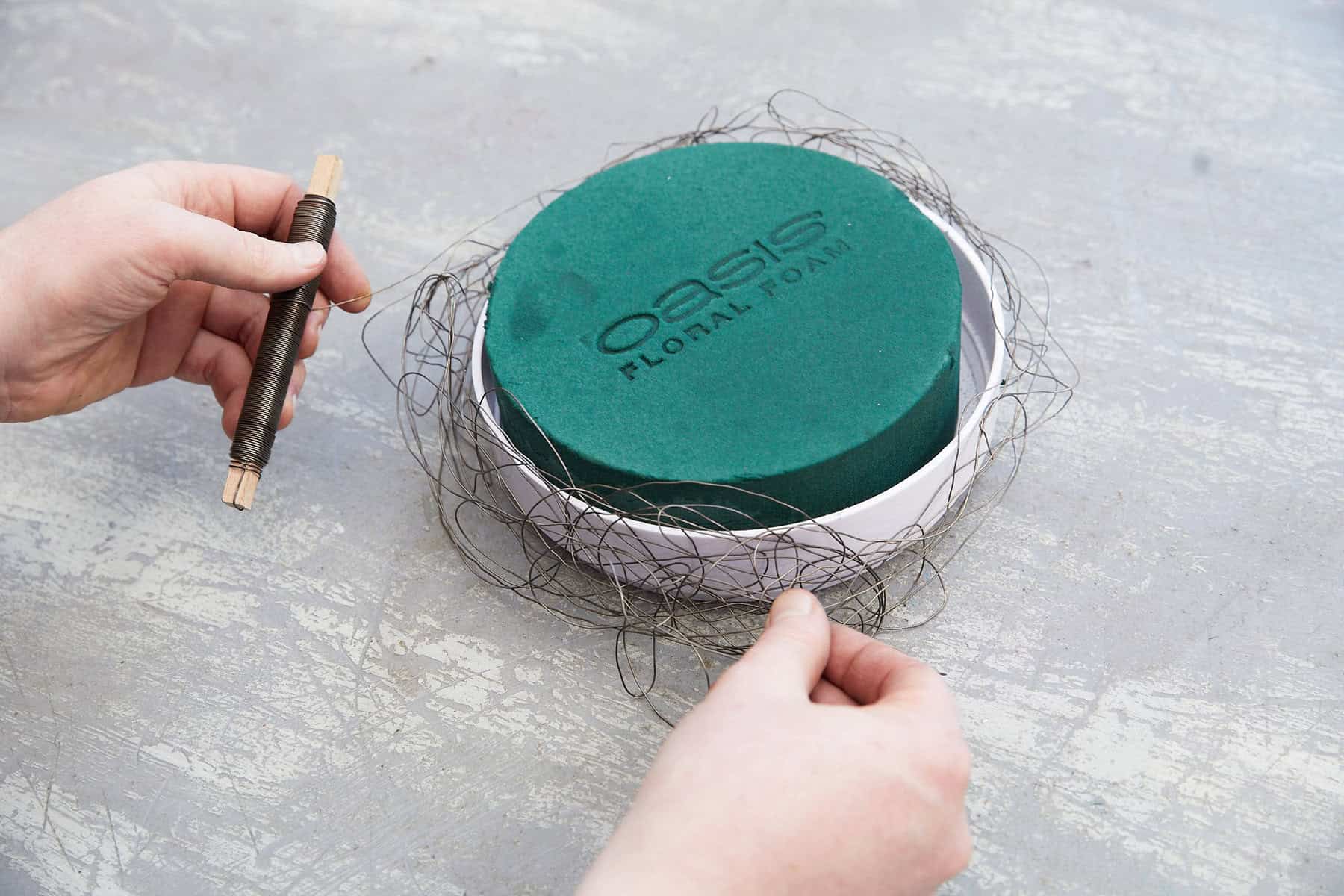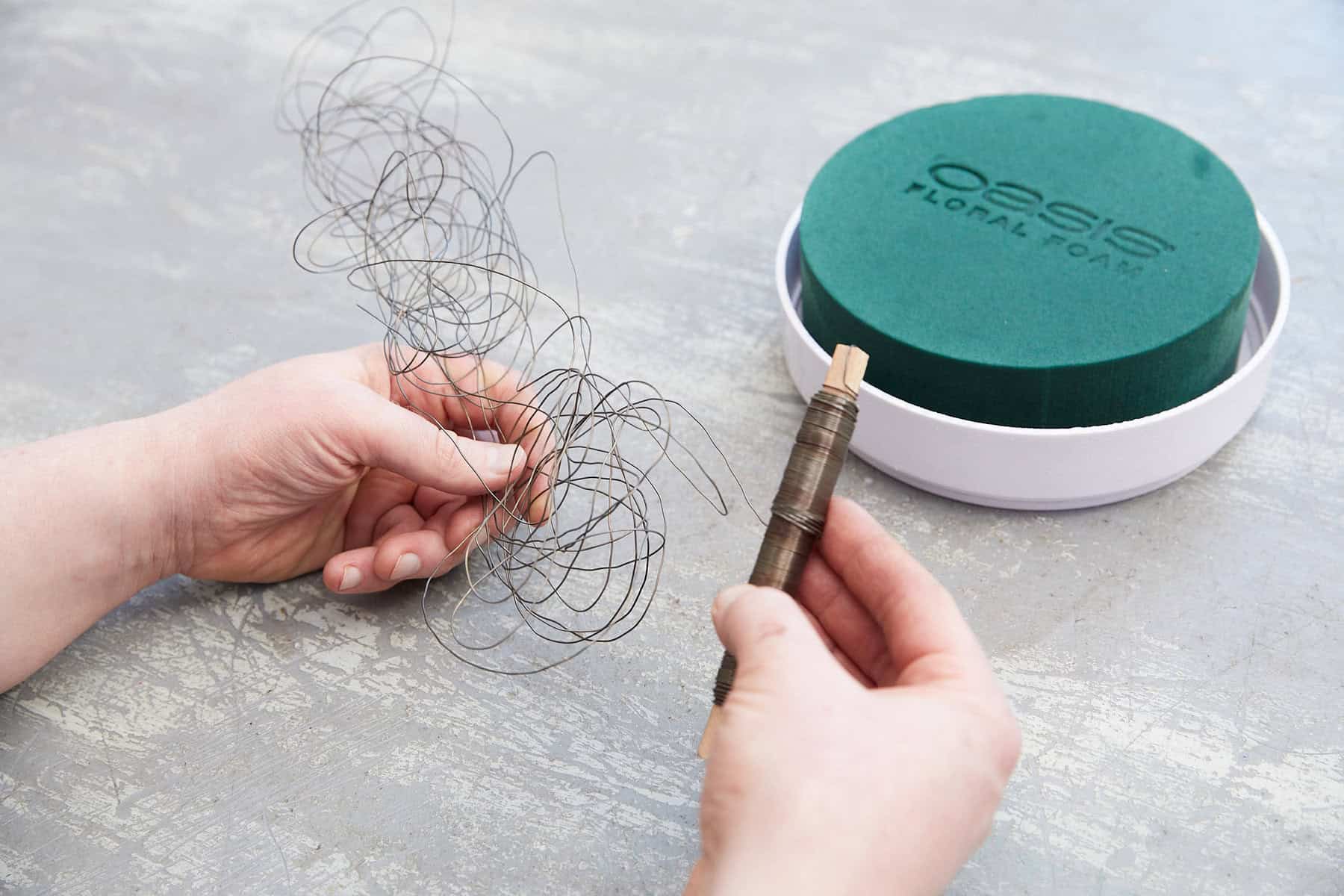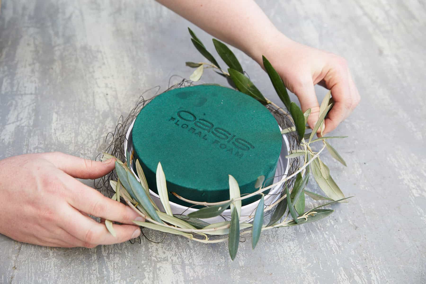 Den Wickeldraht von der Rolle spulen und zusammenknautschen. Als Kranz um die Schale des gewässerten Frischblumensteckschaums legen und fixieren. Olivenzweige in das Drahtgeflecht, dann Floralien in den Steckschaum einarbeiten.