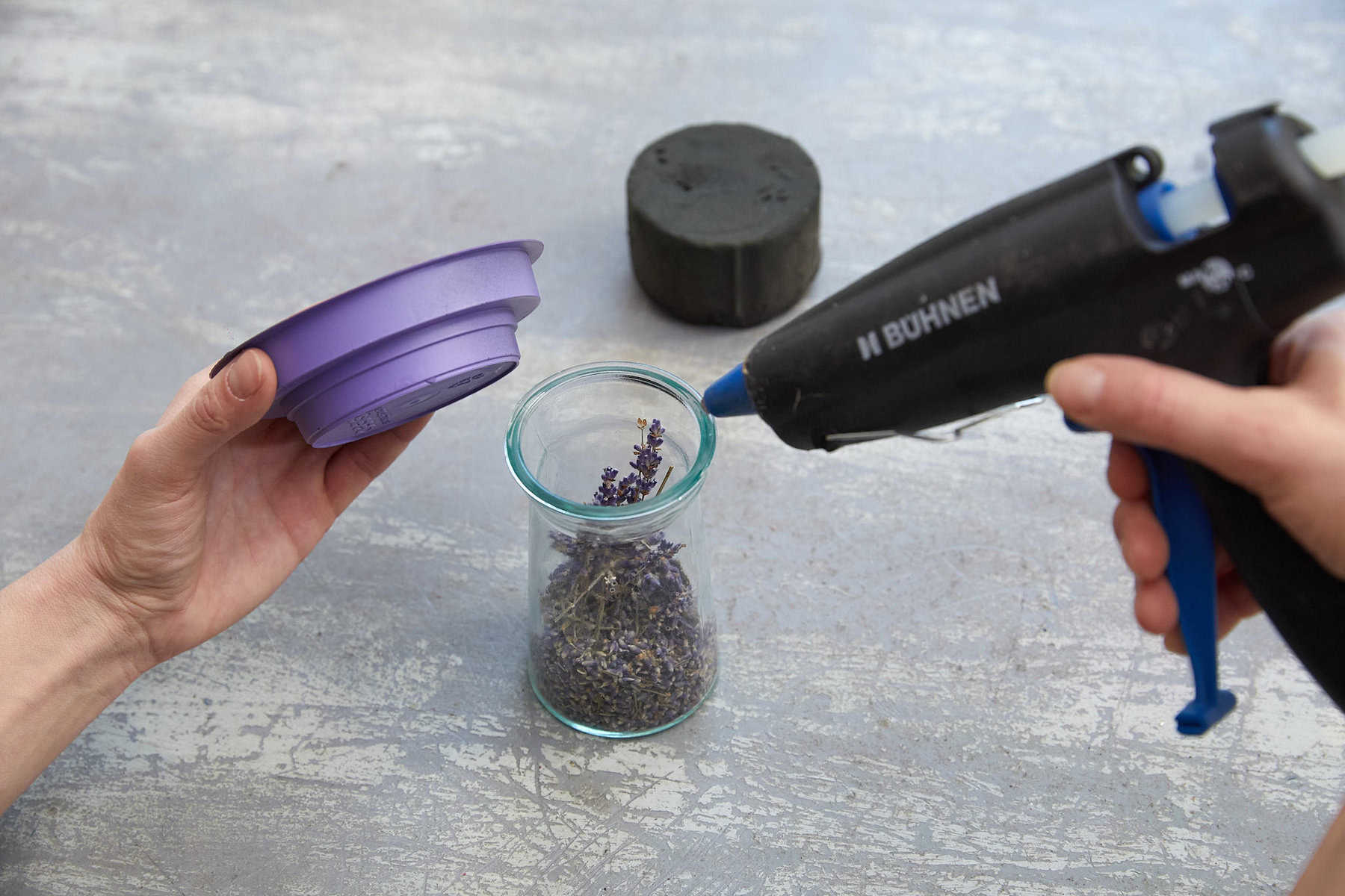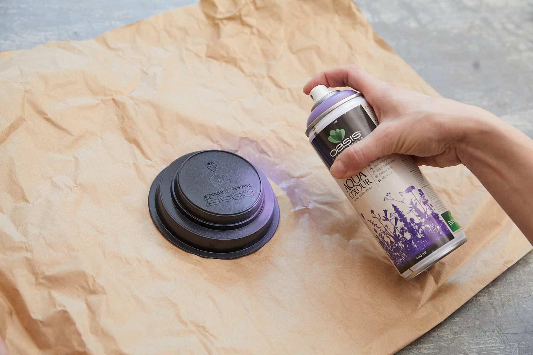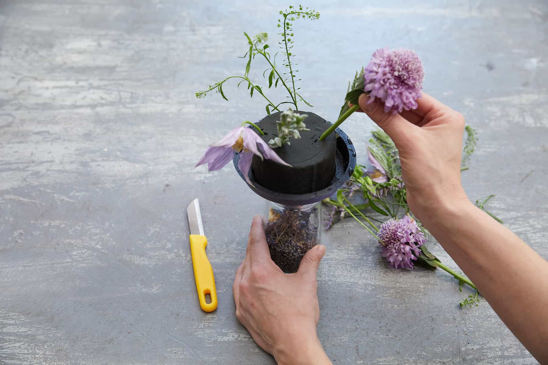 Steckschaum aus der Kunststoffschale lösen und diese kolorieren. Dann auf den Rand der Vase kleben, die mit trockenen Blüten gefüllt ist. Gewässerten Steckschaum wieder einsetzen, Floralien kürzen und einarbeiten.