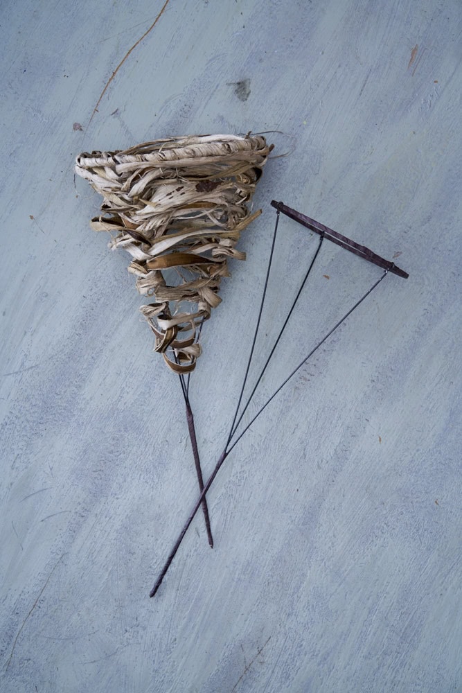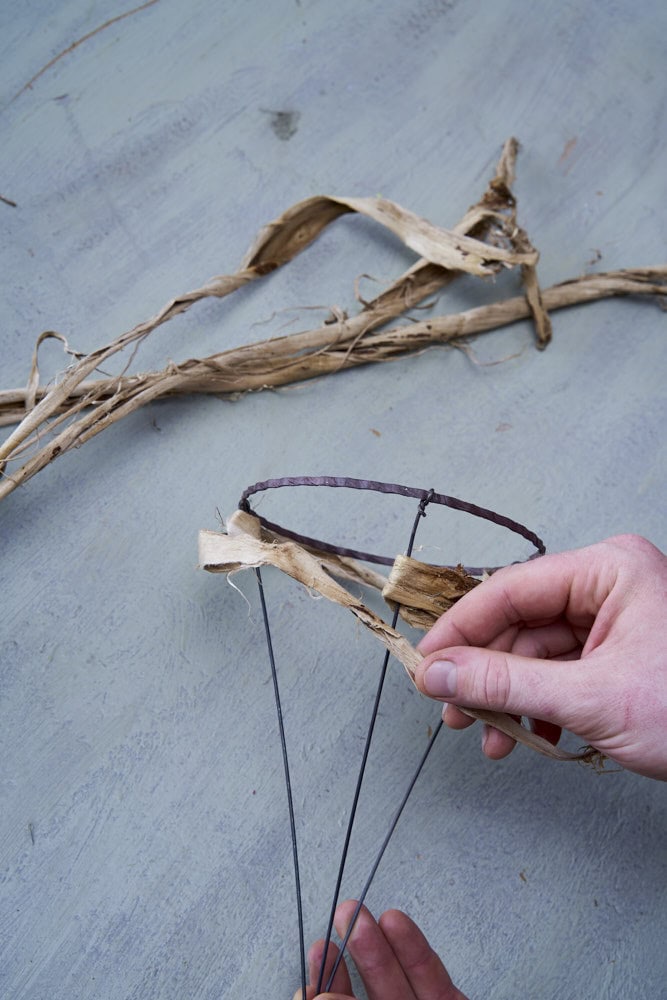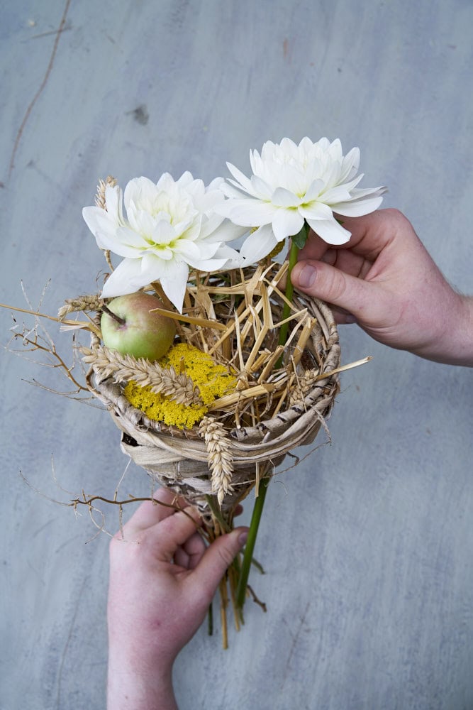 Damit die Maulbeerbaumrinde flexibler ist, vorher in Wasser einweichen. Dann um den Ring wickeln und durch das Gestell flechten. In die entstandene Tütenform nun die Floralien einfügen und mit einer Schnur umwickeln. Einzelne Mohnkapseln ebenfalls mit Schnur versehen und mit Tackernadeln an den Strauß fixieren. Diesen anschließend in ein wassergefülltes Gefäß stellen.