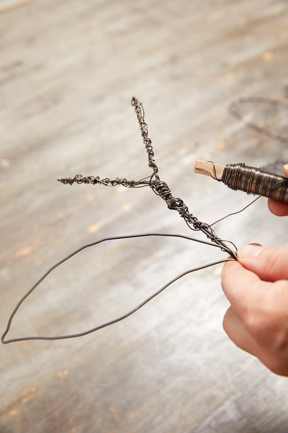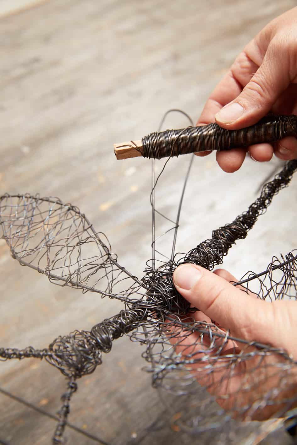 Zunächst den Steckdraht zur Y-förmigen Gabel biegen und die einzelnen Äste mit dem Wickeldraht umwinden. Nun im unteren Bereich aus Steckdraht eine ovale Schlaufe anlegen und ebenfalls mit Wickeldraht kreuz und quer umwickeln. Gegenüberliegend ein zweites Oval als Flügel des Insektes anbringen. Nun noch den Körper durch weiteres Umwickeln auf die gewünschte Stärke bringen und die Libelle in die Topferde stecken.
