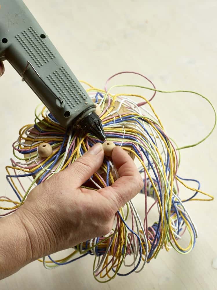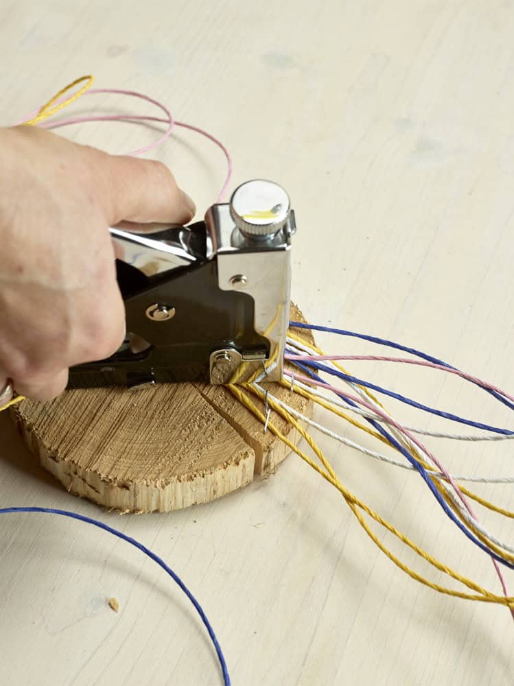 Zuerst gleichlange bunte Papierdrähte rundum auf die Baumstammscheibe tackern. Die Enden der Drähte mit einheitlichem, aber großzügigen Abstand um den Wellendrahtring wickeln. Die Perlen als Füße unter die Baumstammscheibe mittels Heißkleber aufkleben. Die Traubenhyazinthen in ein mit Wasser gefülltes Glas stellen und mittig auf die Baumstammscheibe zwischen den Wellendrahtring platzieren.
