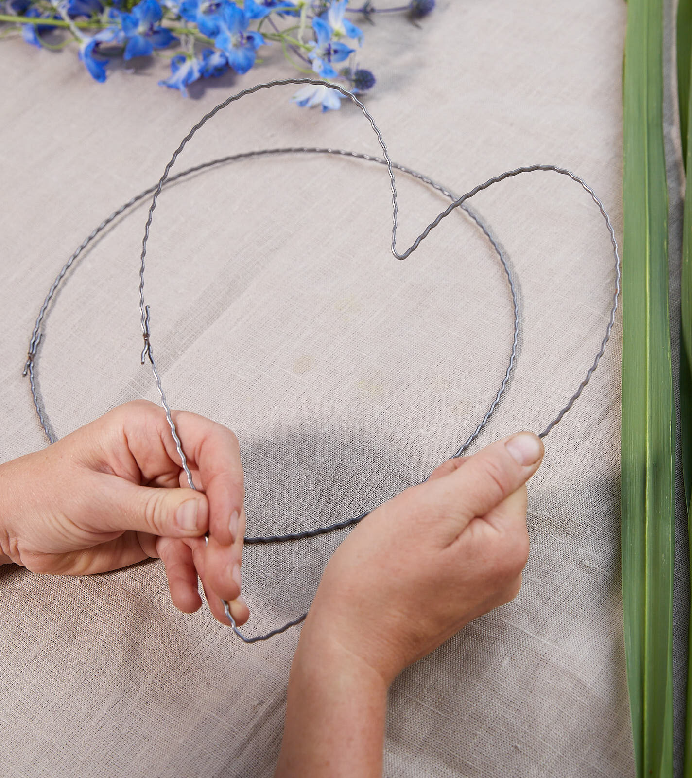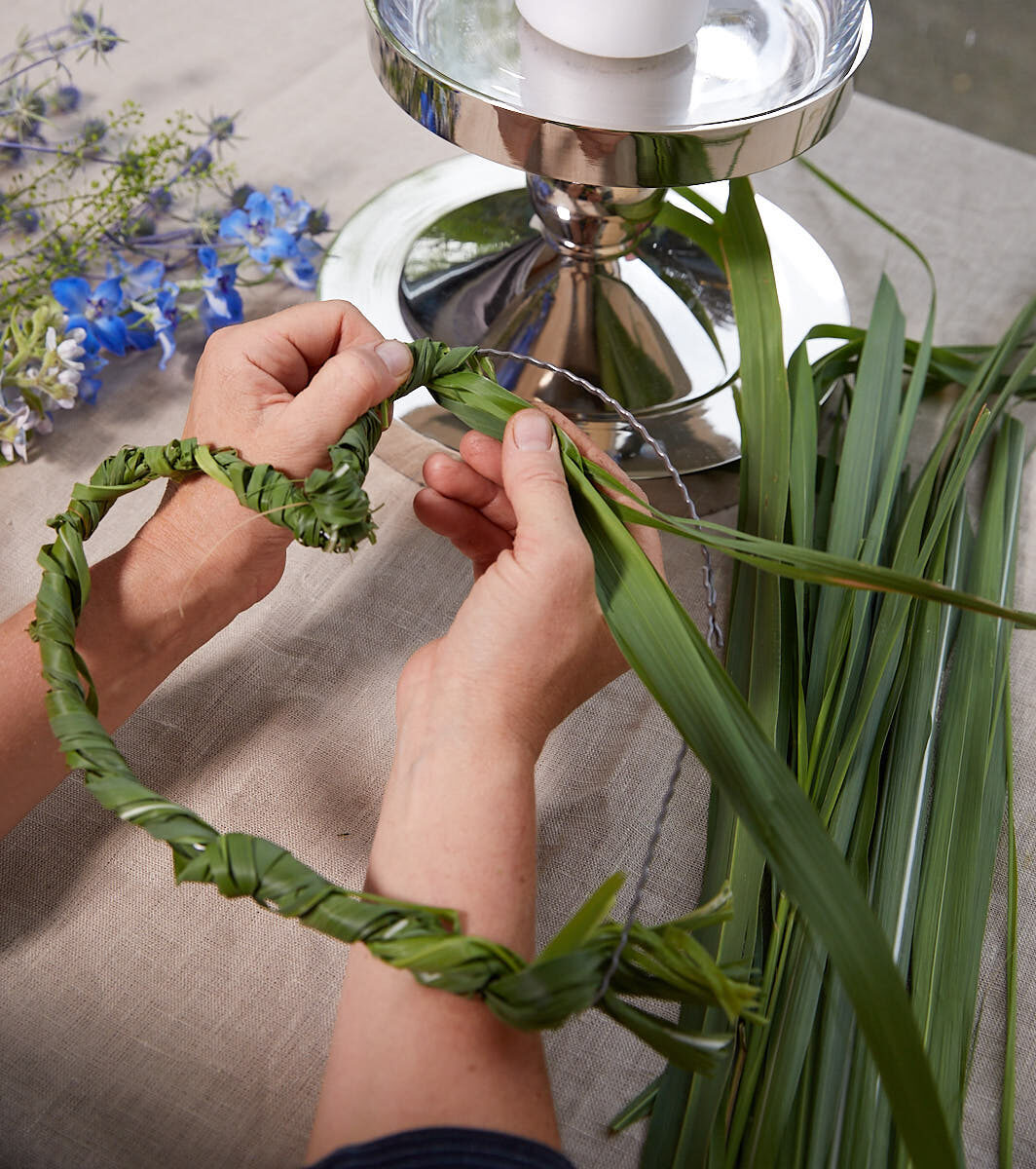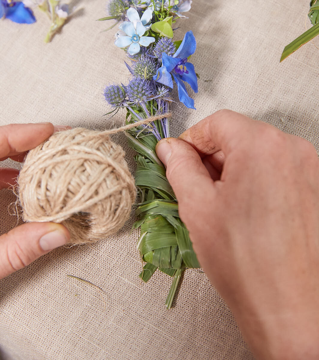 Das Wellendrahtherz mittels Wickeldraht mit Chinaschilf ummanteln und am Ende mit Juteschnur fixieren. Für den Blüten-Akzent Schmuck, einen Schenkel des Herzes mithilfe der Juteschnur abwechselnd mit Blüten und Gräsern bewickeln. Anschließend das Herz, ebenfalls mit Juteschnur, außen am Windlicht anbringen.