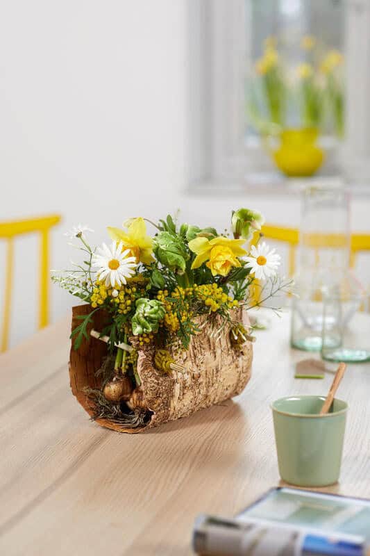 Die Rinde zu einer Mulde biegen und innen mit wasserdichter Folie auskleiden. Anschließend eine Schicht Moos einlegen, um die Folie zu kaschieren. An beiden Seiten vorsichtig je zwei kleine Öffnungen einarbeiten, die Holzstäbe hindurchschieben und außen mit Schnur fixieren. Blumenzwiebeln und Frühlingsblumen locker in die Rindenschale setzen.