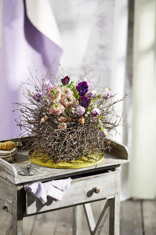 Wickeldraht abspulen, leicht verknüllen und um die Glasvase legen, bis ein locker-wildes Grundgerüst entsteht. Birkenzweige in unterschiedlichen Längen kreuz und quer in das Drahtgeflecht einstecken. Das Glas mit Wasser füllen und die Frühlingsblumen locker einstellen.