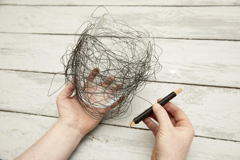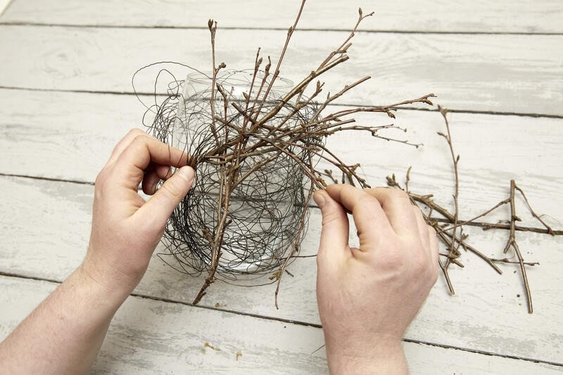 Wickeldraht abspulen, leicht verknüllen und um die Glasvase legen, bis ein locker-wildes Grundgerüst entsteht. Birkenzweige in unterschiedlichen Längen kreuz und quer in das Drahtgeflecht einstecken. Das Glas mit Wasser füllen und die Frühlingsblumen locker einstellen.