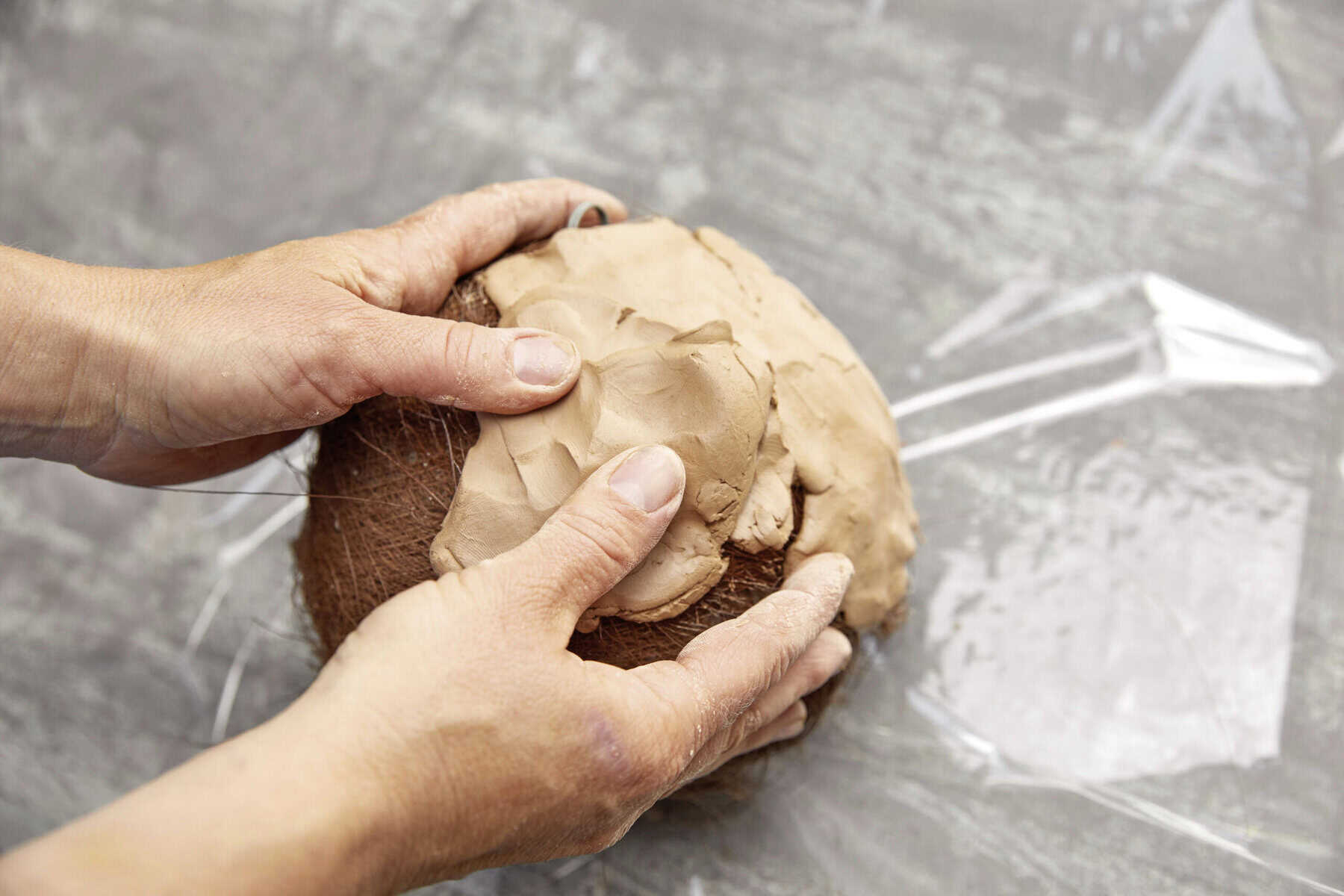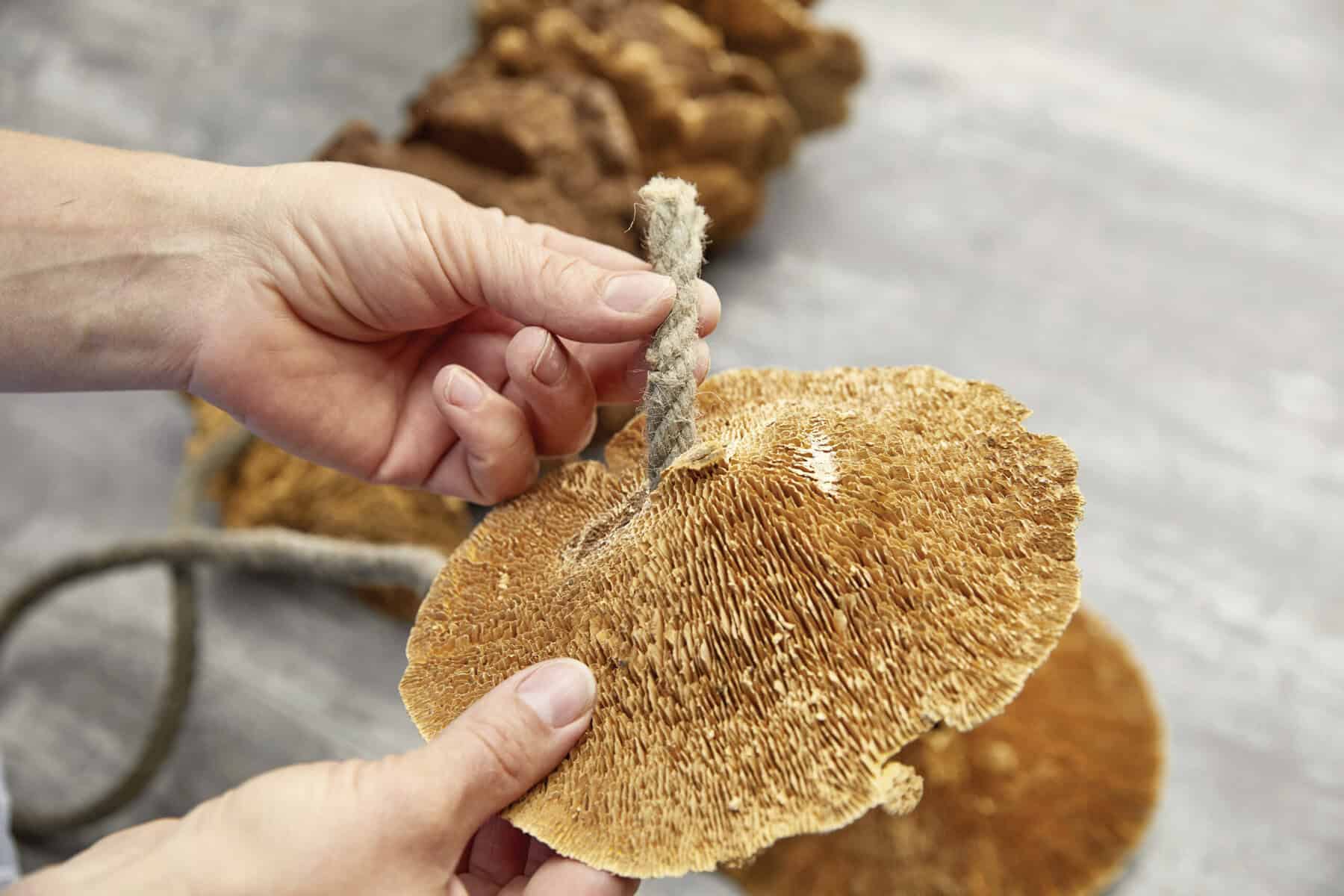 Drahthaken durch die Korkkugel schieben, das Ende umbiegen, das Seil daran befestigen und dann das Drahtende zurückstecken. Die Kugel mit Kokosfasern behaften und die abstehenden Fasern mit Leim fixieren. Gemisch aus Ton und Holzleim auf die Kugel auftragen und gut trocknen lassen. Die Baumpilze und Torfplatten anbohren und auf das Seil auffädeln. Dieses dann aufhängen.
