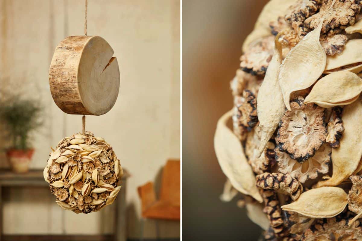 Schlicht und einfach kommt die Schönheit der Natur in einem kunstvollen Objekt zum Vorschein. Die dicke Baumscheibe ist mit Schraubösen versehen, woran sich die Schnüre zur Aufhängung anbringen lassen. Die Kugel aus Kork ist mit getrockneten Zimtapfel-Fruchtscheiben sowie Flaschenbaum-Früchten ummantelt.