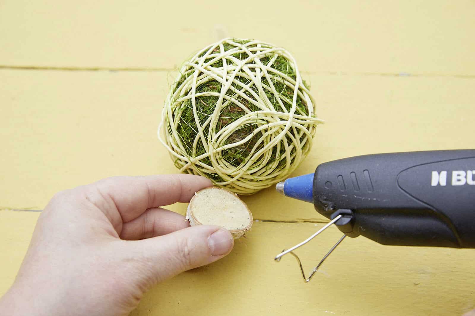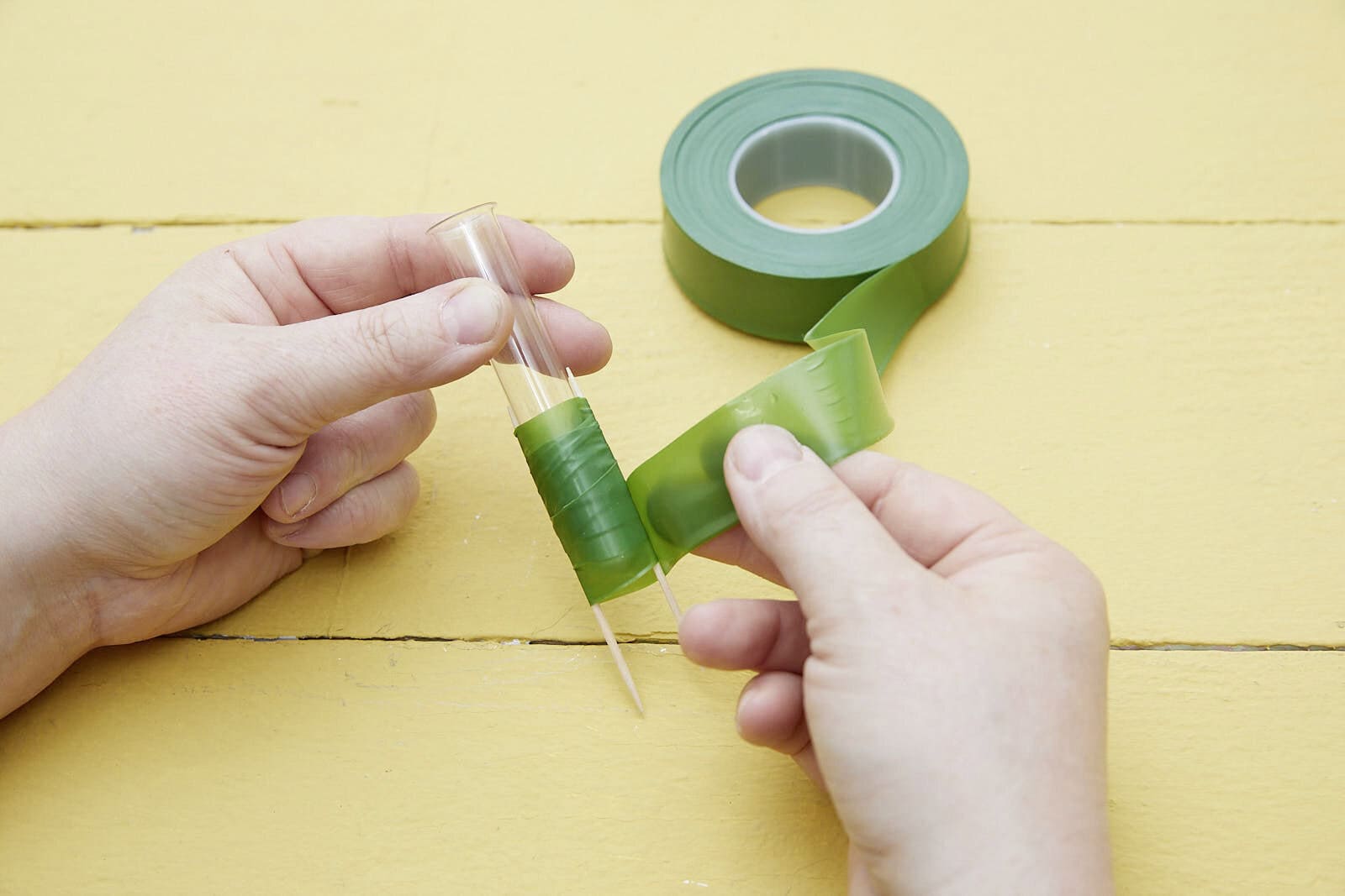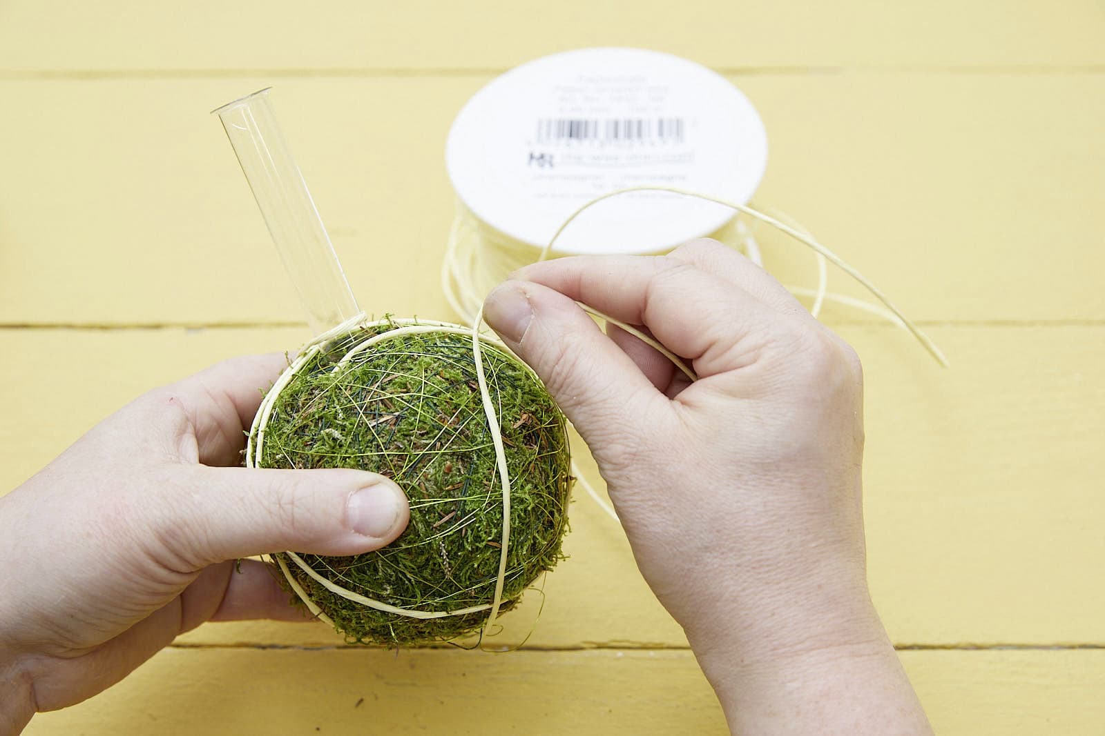 Zwei Holzspieße mithilfe von Parafilm um das Glasröhrchen herum befestigen. Dann um das untere Ende des Glasröhrchens Lappenmoos fest zu einer Kugel wickeln und mit Decolackdraht fixieren. Anschließend die Mooskugel mit Papierdraht umwickeln, sodass eine netzartige Struktur entsteht. Eine kleine Holzscheibe als Fuß ankleben. Das Glasröhrchen mit Wasser füllen und die Floralien einstellen.