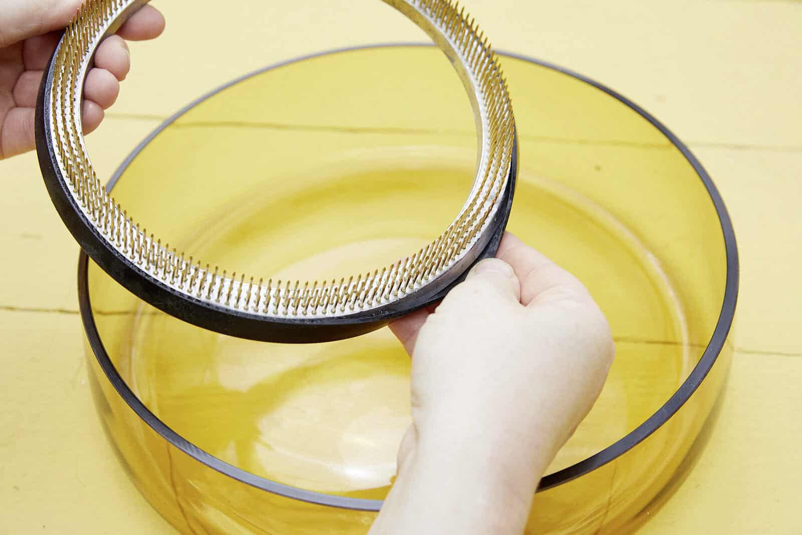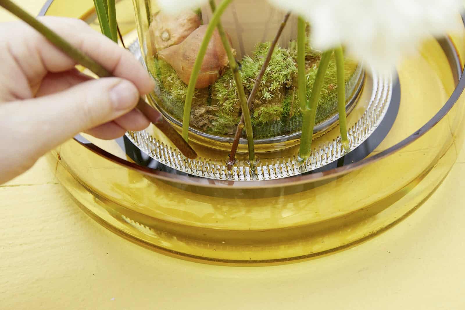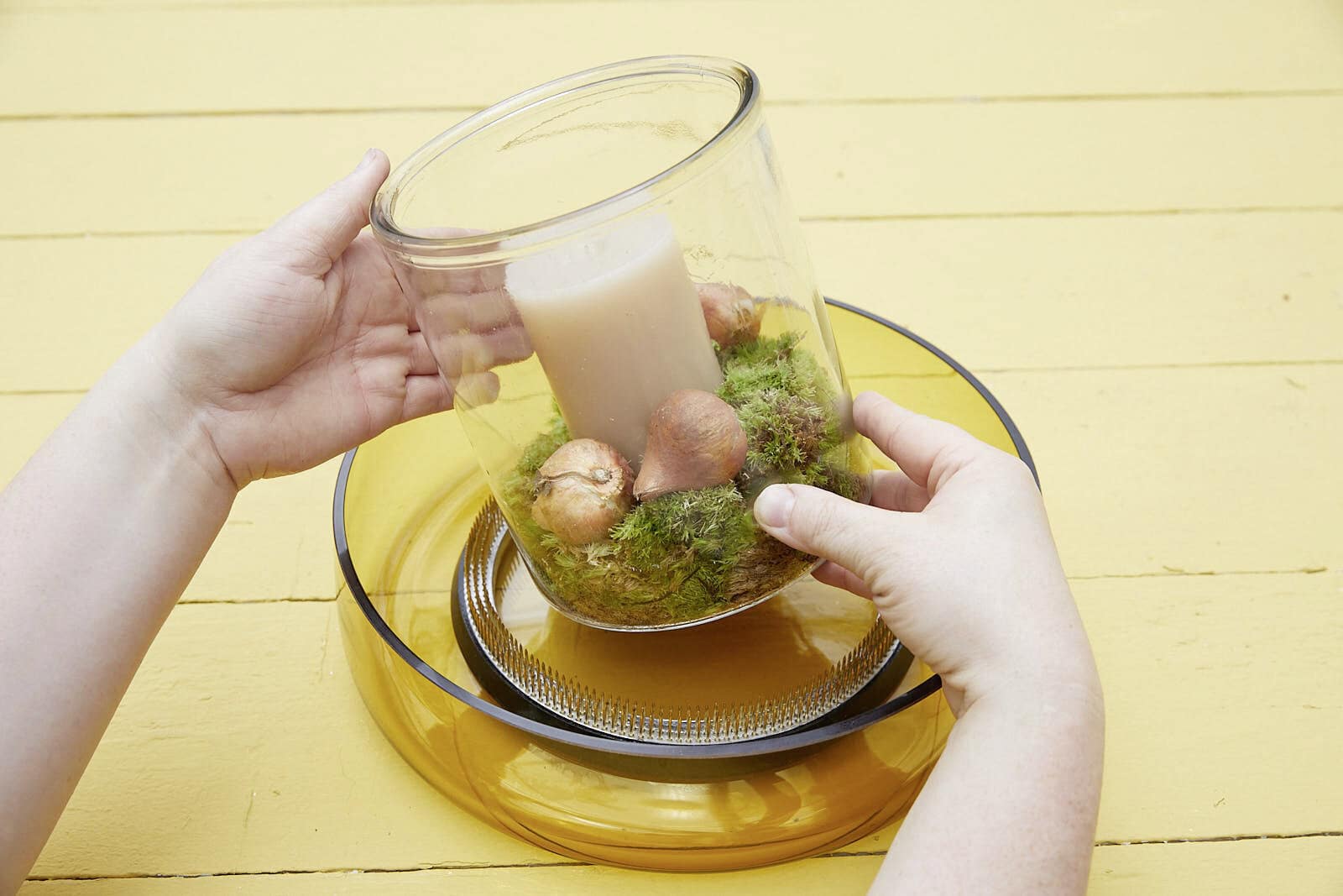 Den Kenzan-Ring in der Glasschale platzieren und diese mit Wasser füllen. Das Glasgefäß mit Moos, Tulpenzwiebeln und der Kerze bestücken und mittig im Kenzan-Ring platzieren. Die Blumenstiele senkrecht in den Kenzan-Ring stecken.
