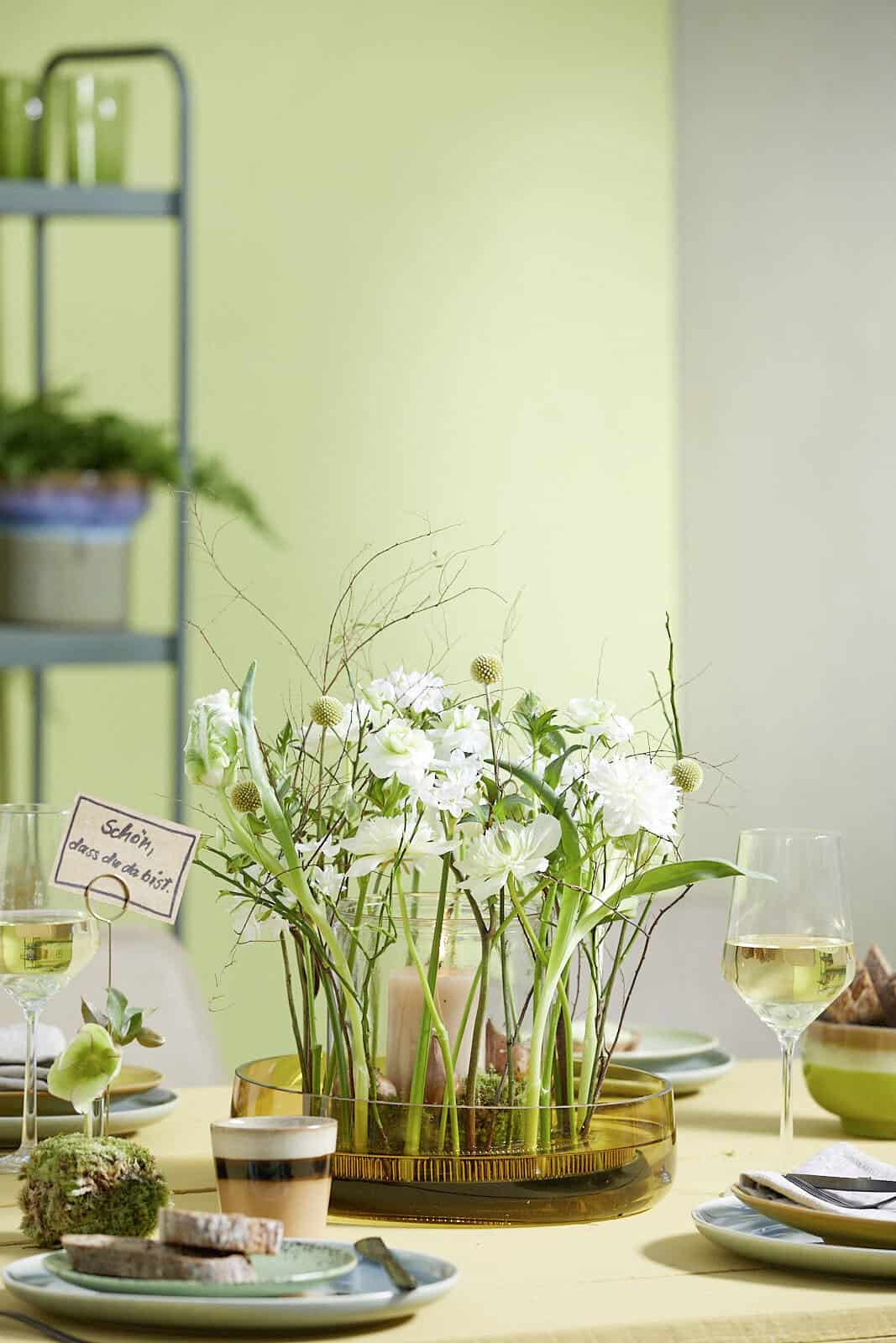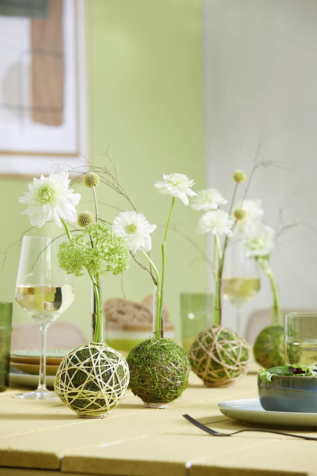 Grünes Moos steht im Frühjahr für Frische und Neubeginn. Diese Symbolik wird auch in unserer Tischdeko aufgegriffen. Dabei kommen alternative Steckhilfen wie ein Kenzan oder verschiedene Drahtprodukte von H & R the-wire-man zum Einsatz.