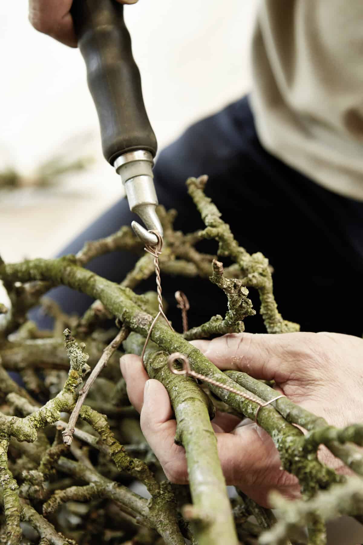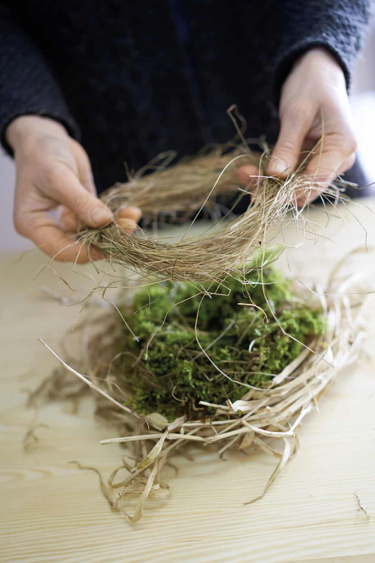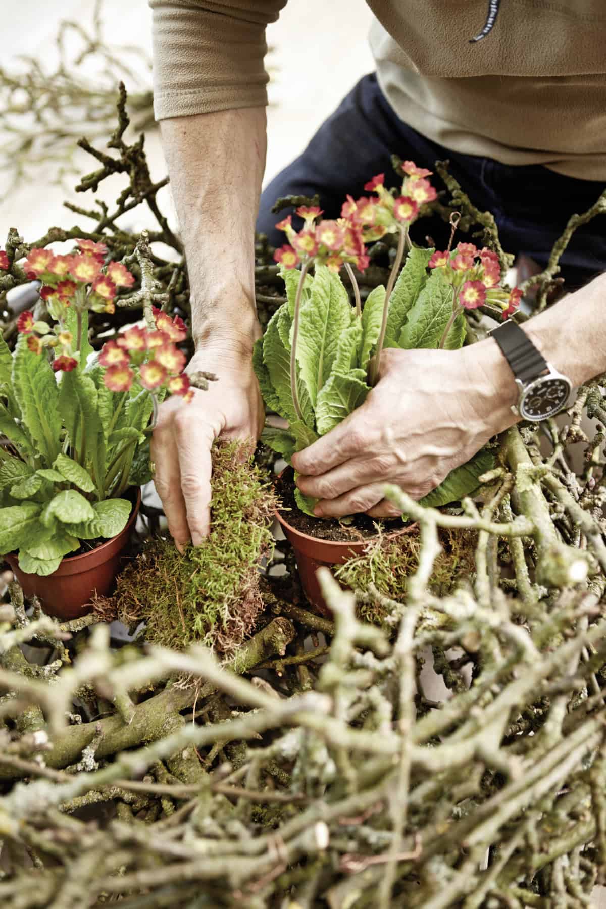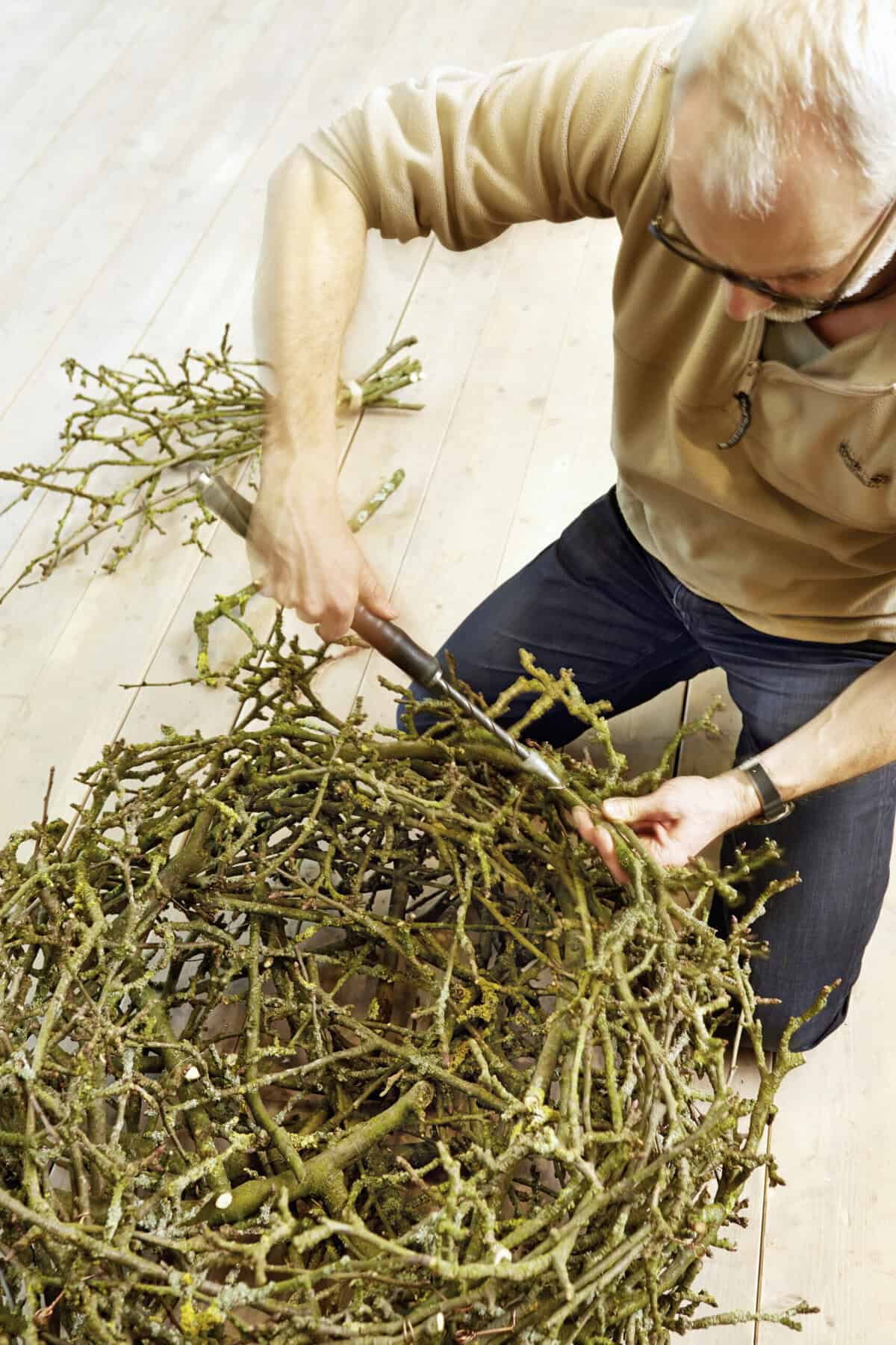 Zunächst etwa 5 Äste zu einem Grundkranz zusammenbinden. Dann immer mehr Äste einarbeiten und mithilfe des Twisters und Twistdrahts aneinander befestigen, sodass eine große Nestform entsteht. Dann die Pflanzen samt Kulturtopf in der Mitte platzieren und mit Moos kaschieren. Zum Schluss Eier dekorieren.