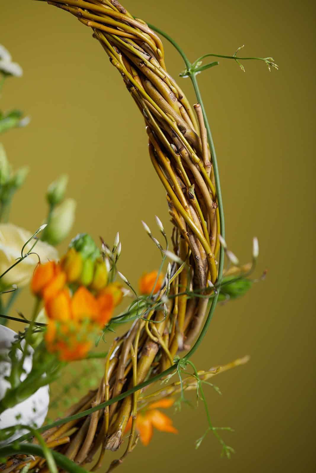 Zunächst einen Wellendrahtring mit Floraltape versehen und zu einem Ei formen. Mehrere Trauerweidenäste zusammennehmen, in sich leicht verdrehen,