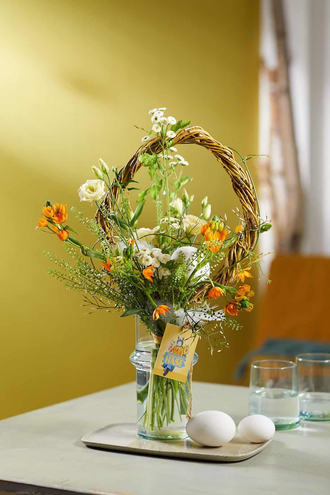 unteren Bereich des Weiden-Eis als Halterung befestigen. Die Blumen nun zusammen mit dieser Halterung zum Strauß binden, Federn und Ei ergänzen, Strauß in eine wassergefüllte Vase stellen und das „Hermann Hase”-Etikett anbringen.