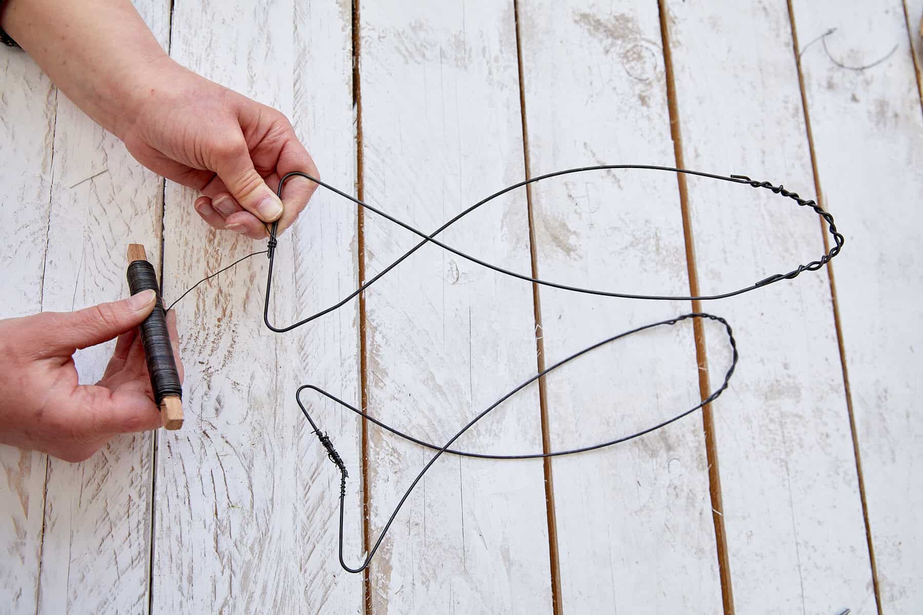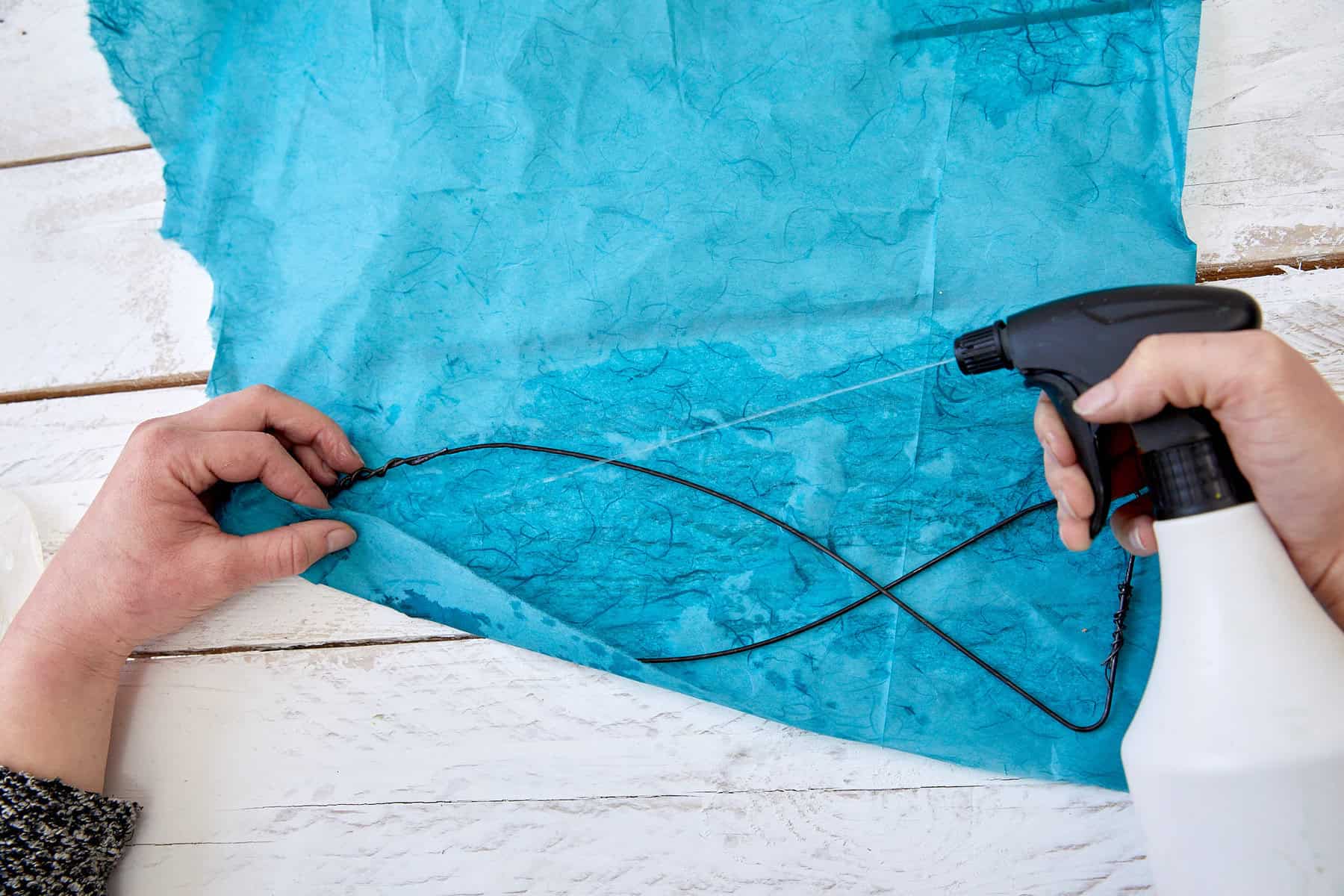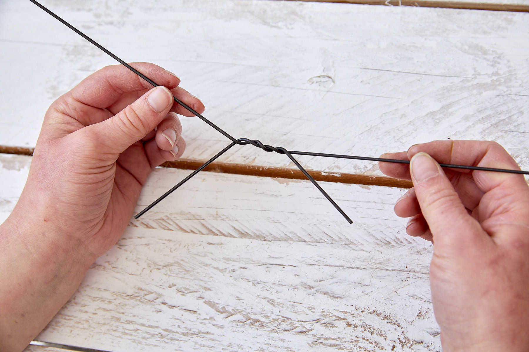 Die Gläser mit Motivpapier ummanteln und mit Wickeldraht fixieren. Hasendraht als alternative Steckhilfe jeweils in die Gläser legen und die Blüten darin einstecken. Für die Drahtfische jeweils zwei Steckdrähte miteinander verzwirbeln. Dann von der Mitte aus die ovale Fischform bilden, anschließend zu den Enden hin den dreieckigen Schwanz formen. Diesen Fisch auf Papier legen, dieses mit Wasser einsprühen, sodass es gut nass ist, die Papierränder dann um die Drahtform klappen und das restliche Papier abschneiden. Zum Schluss jeweils einen Drahtfisch mit weiterem Draht in die Gefäße setzen und gut trocknen lassen.